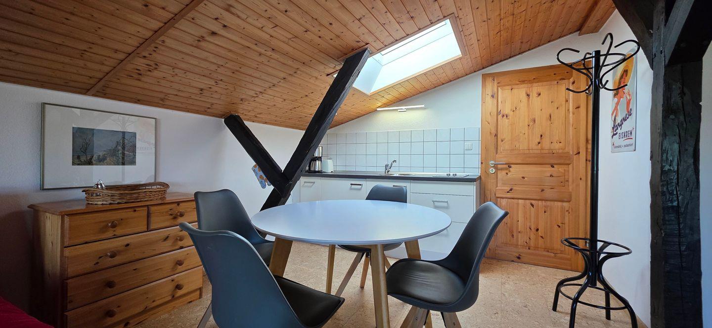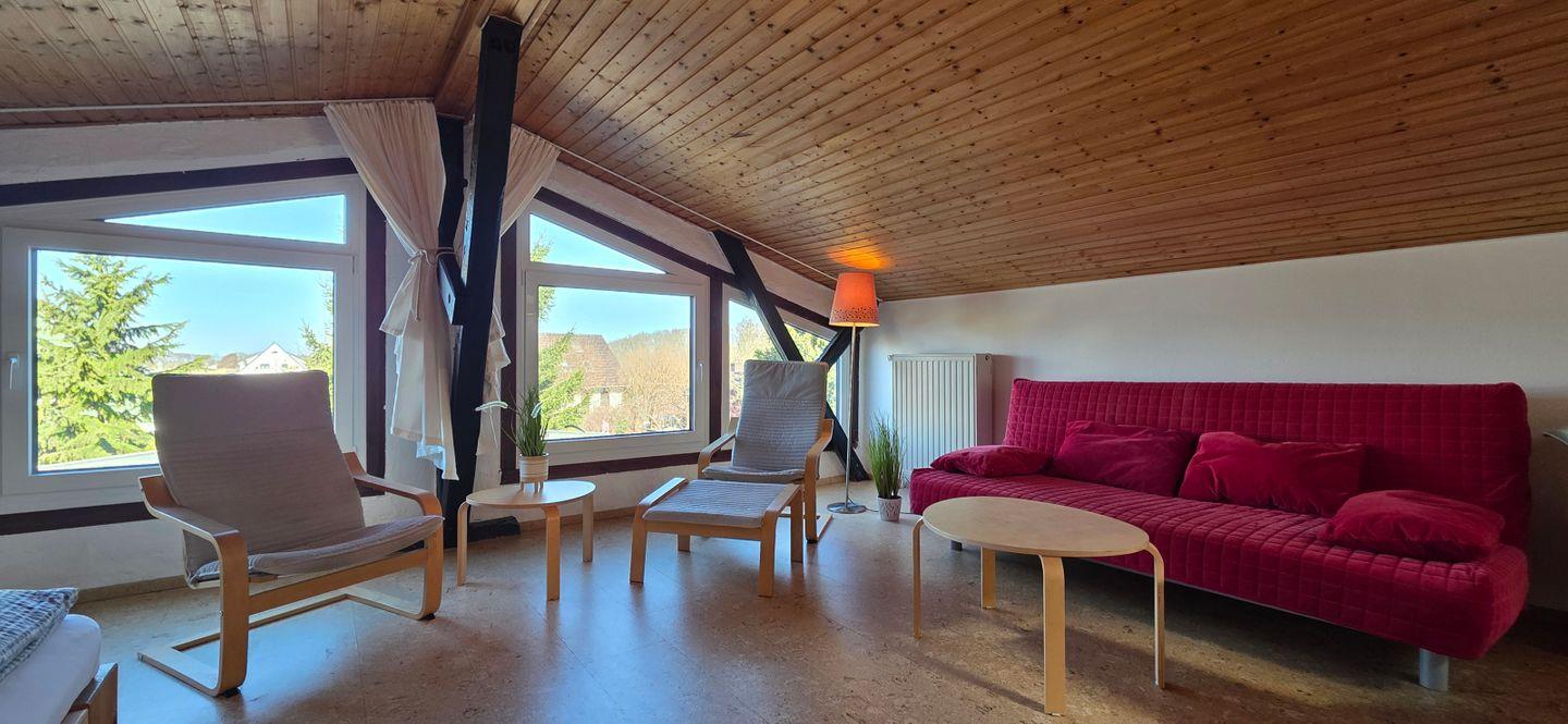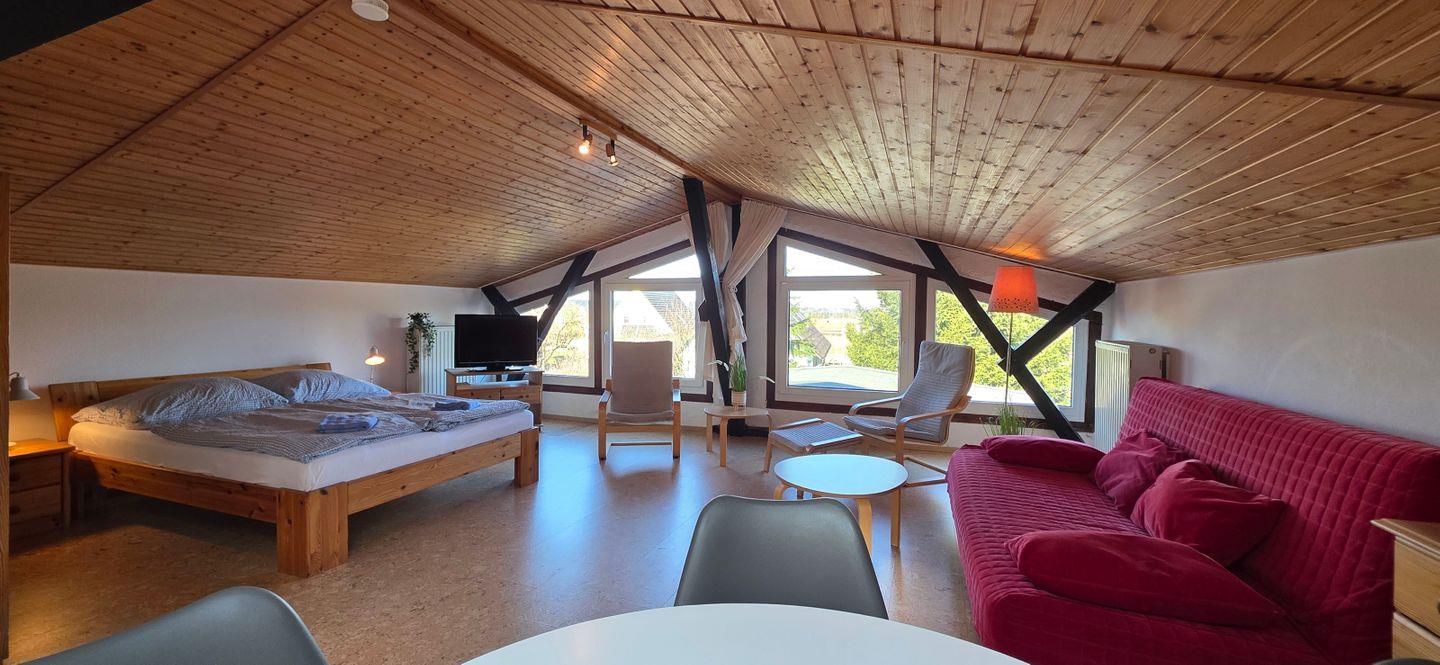 • Offener Wohn- und Schlafbereich mit gemütlicher Sitzgelegenheit, Fernseher und Radio
