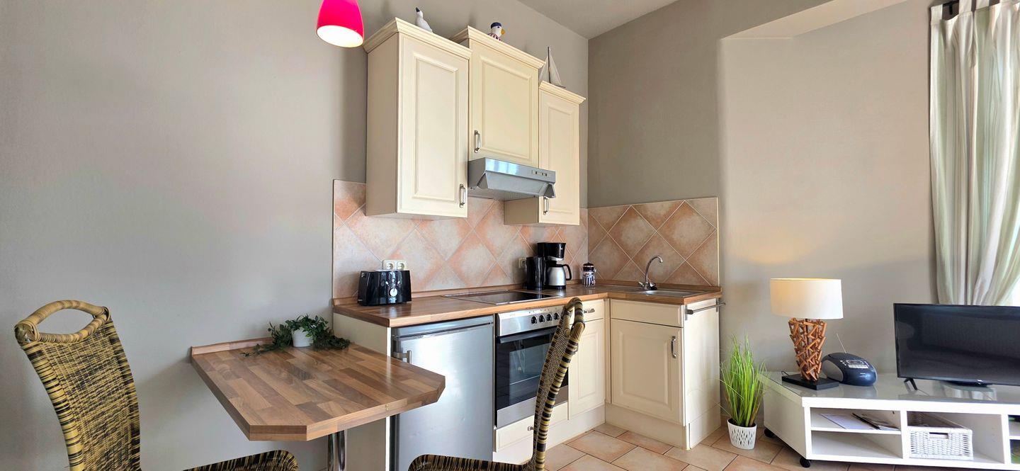 • Offene Küche mit Herd & Backofen, Kühlschrank mit Gefrierfach, Kaffeemaschine, Toaster & Wasserkocher