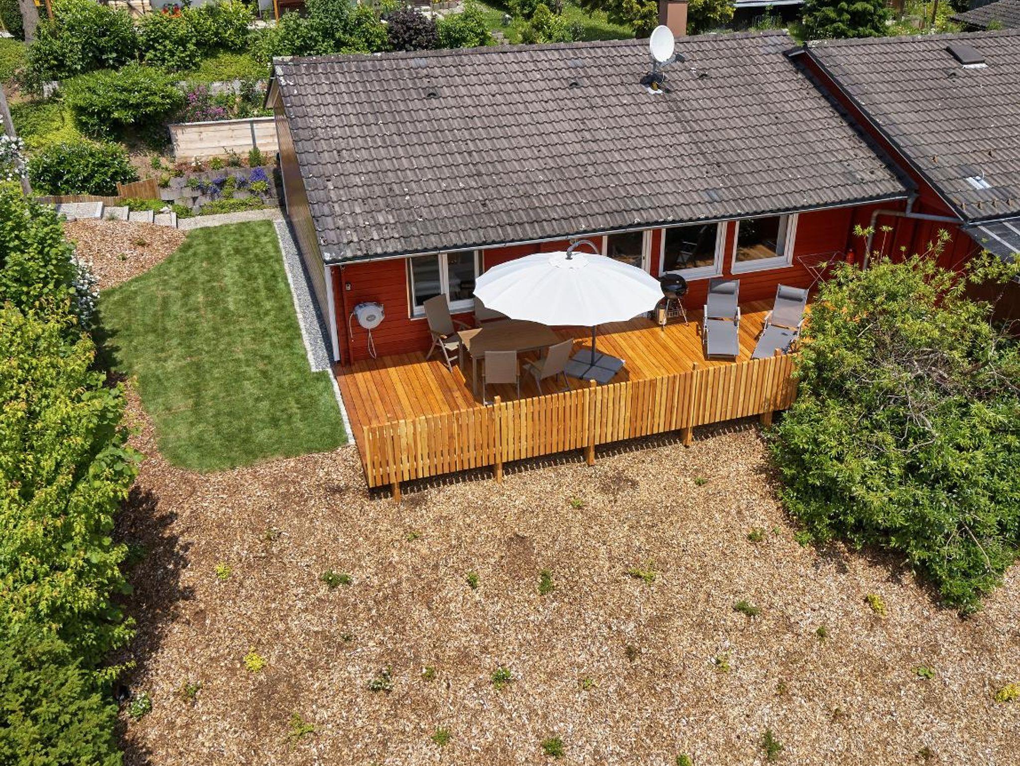 Von der sonnigen Terrasse genießen Sie den Blick ins Grüne. Hier lässt sich der Tag bei einem gemeinsamen Frühstück, einem Grillabend oder einem Glas Wein entspannt ausklingen. Der Garten bietet ausreichend Platz zum Entspannen – auch für Gäste mit Hund.