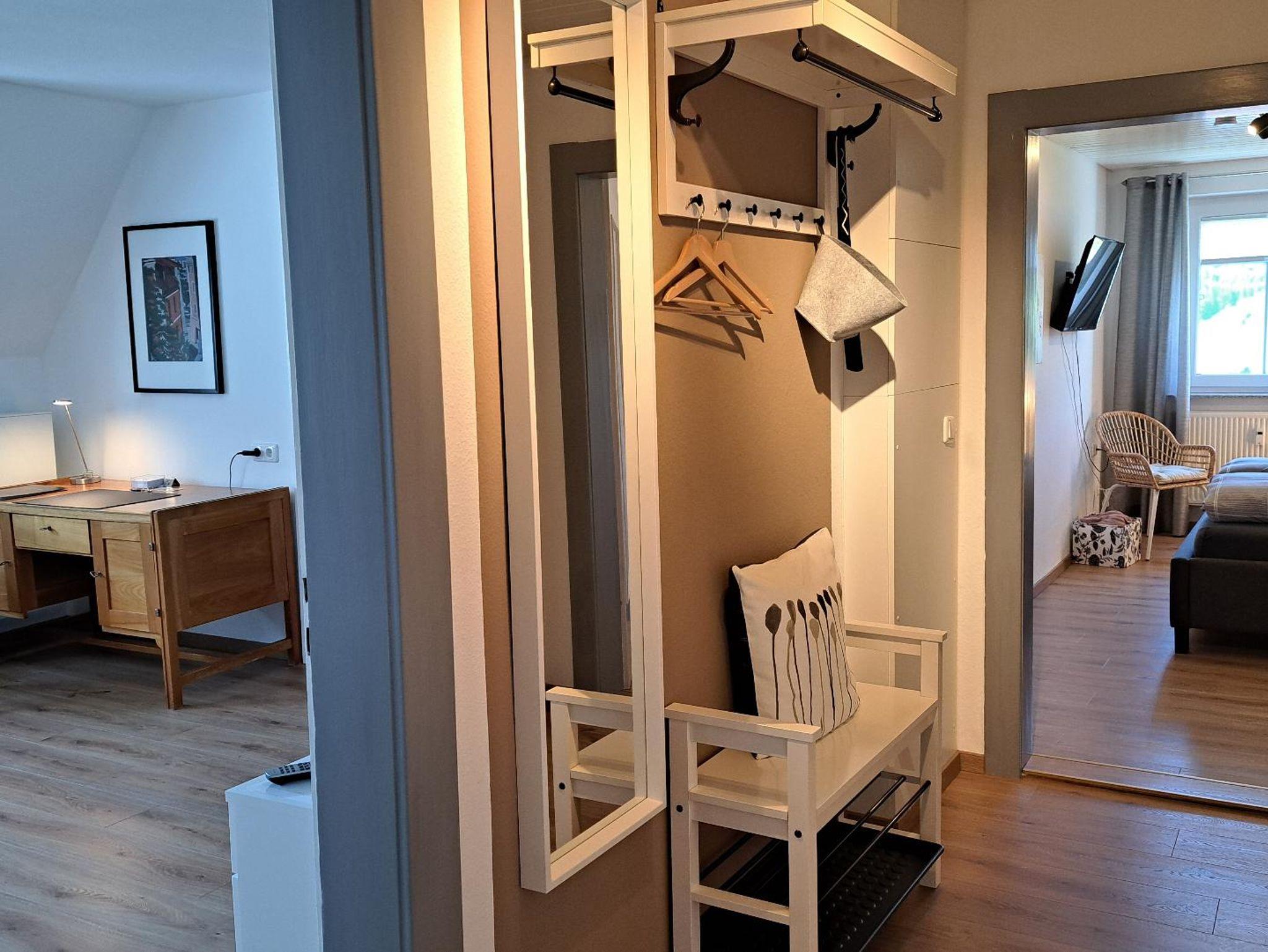 eine großzügige Diele, ausgestattet mit Ganzkörperspiegel, Schuhabstellfläche