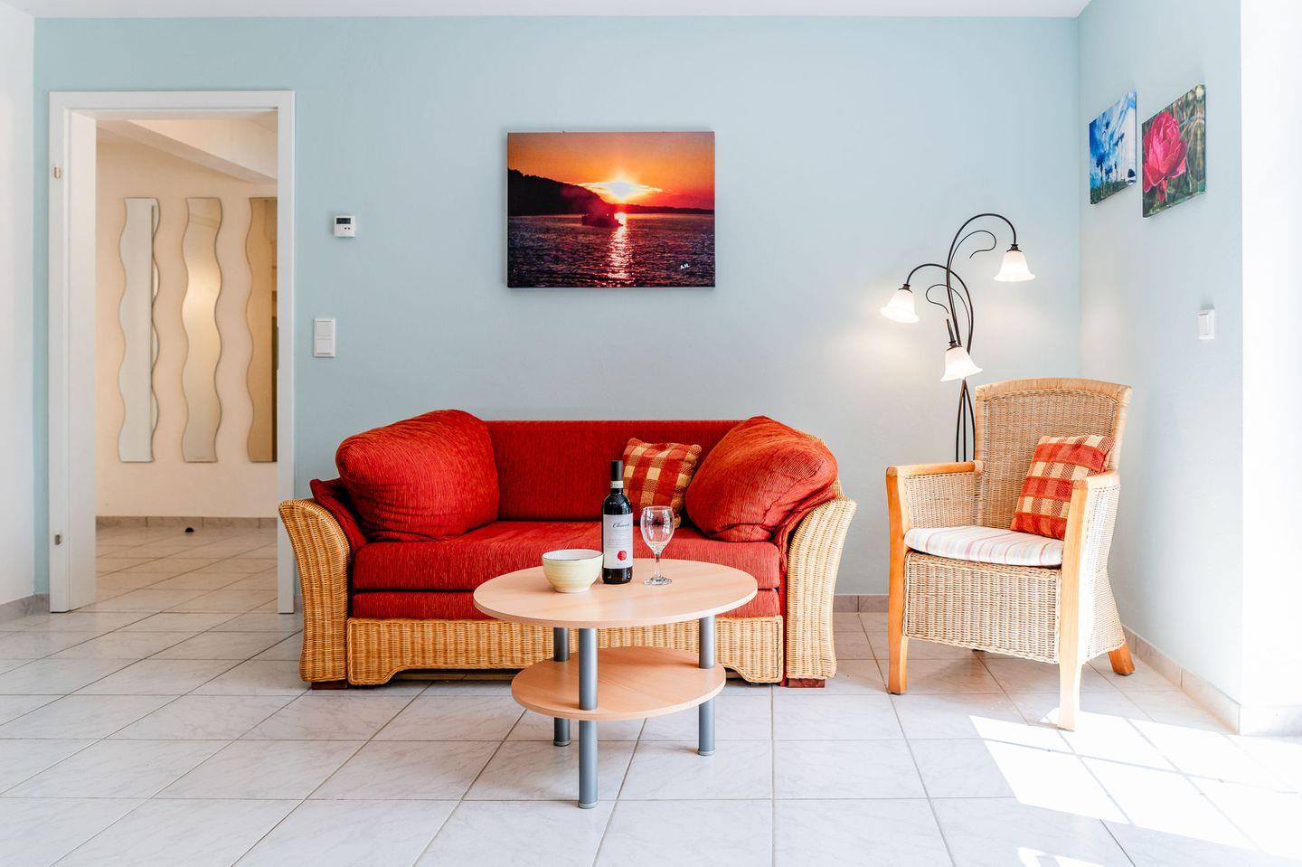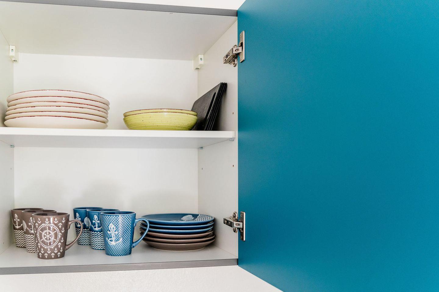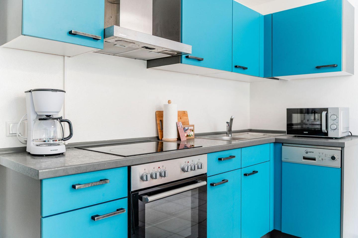 Der helle Wohnbereich mit offener Küche lädt zum Verweilen ein: Hier können Sie gemeinsam kochen, entspannen oder einfach den Tag bei einem Glas Wein oder Wasser ausklingen lassen. Es ist komplett ausgestattet, alles Nötige ist vorhanden und es ist dennoch behaglich – mit warmen Holzelementen, freundlichen Farben und kleinen Details,