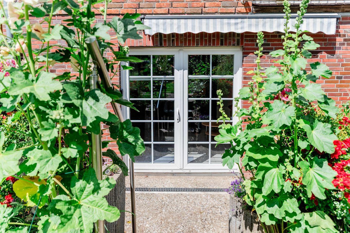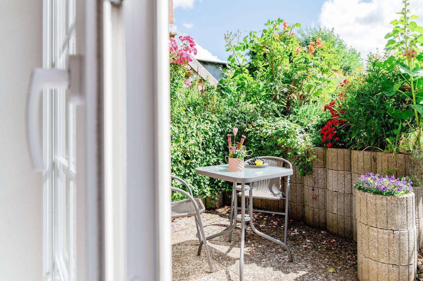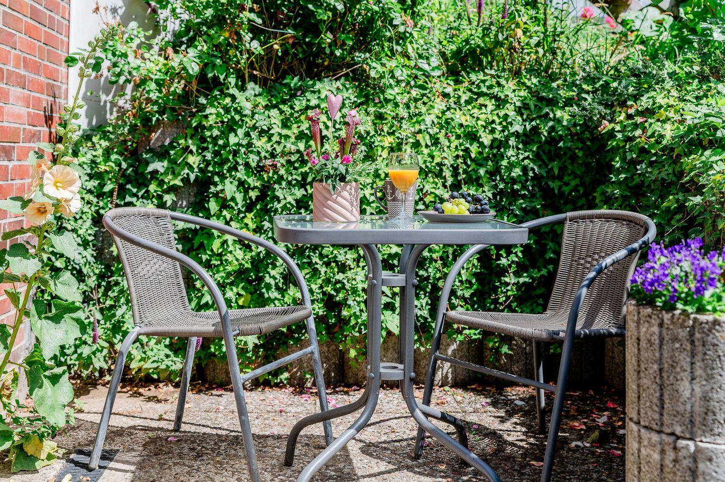 Die sonnige Terrasse mit Gartenmöbeln bietet viel Platz für Frühstück im Freien oder entspannte Abende mit Blick ins Grüne.