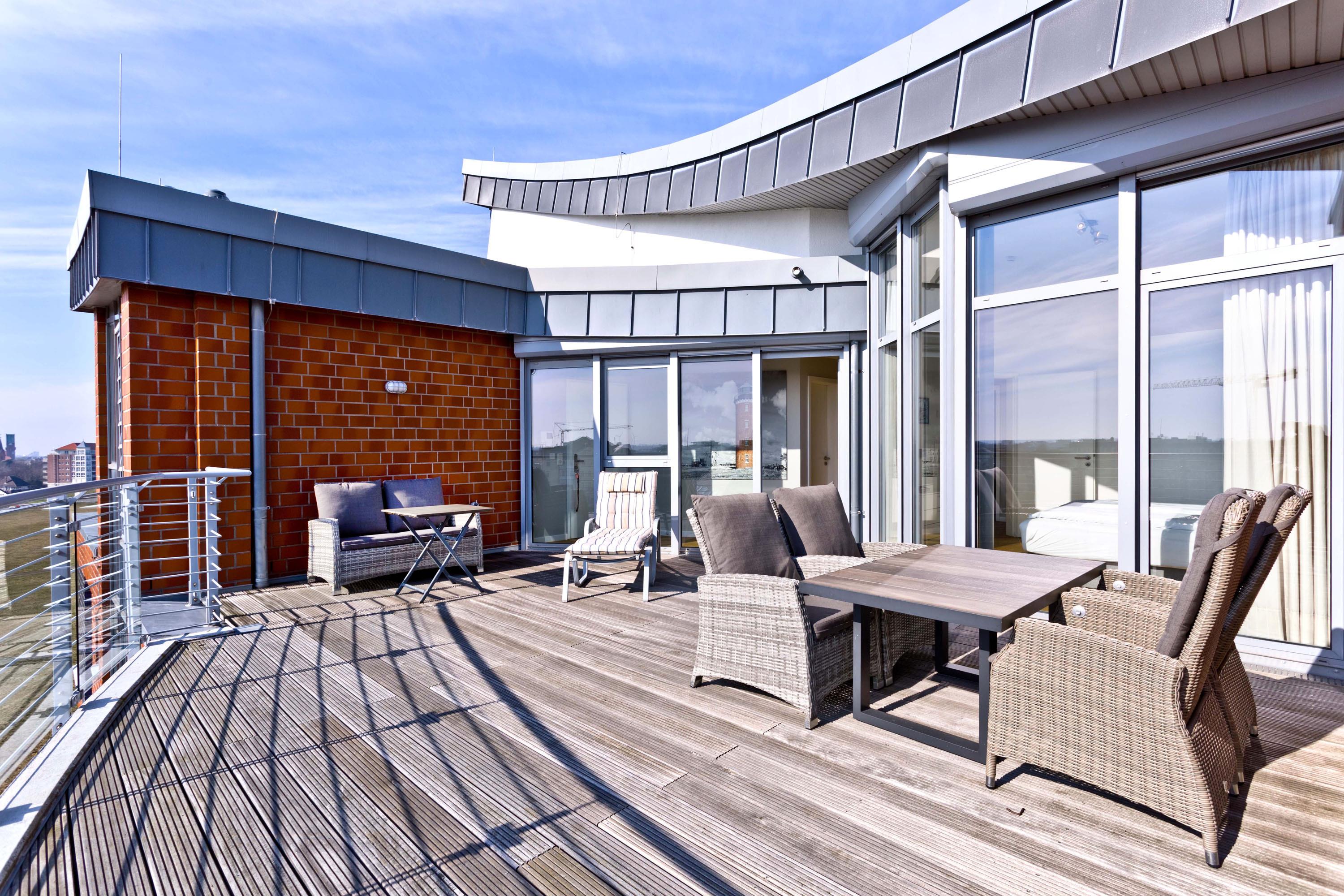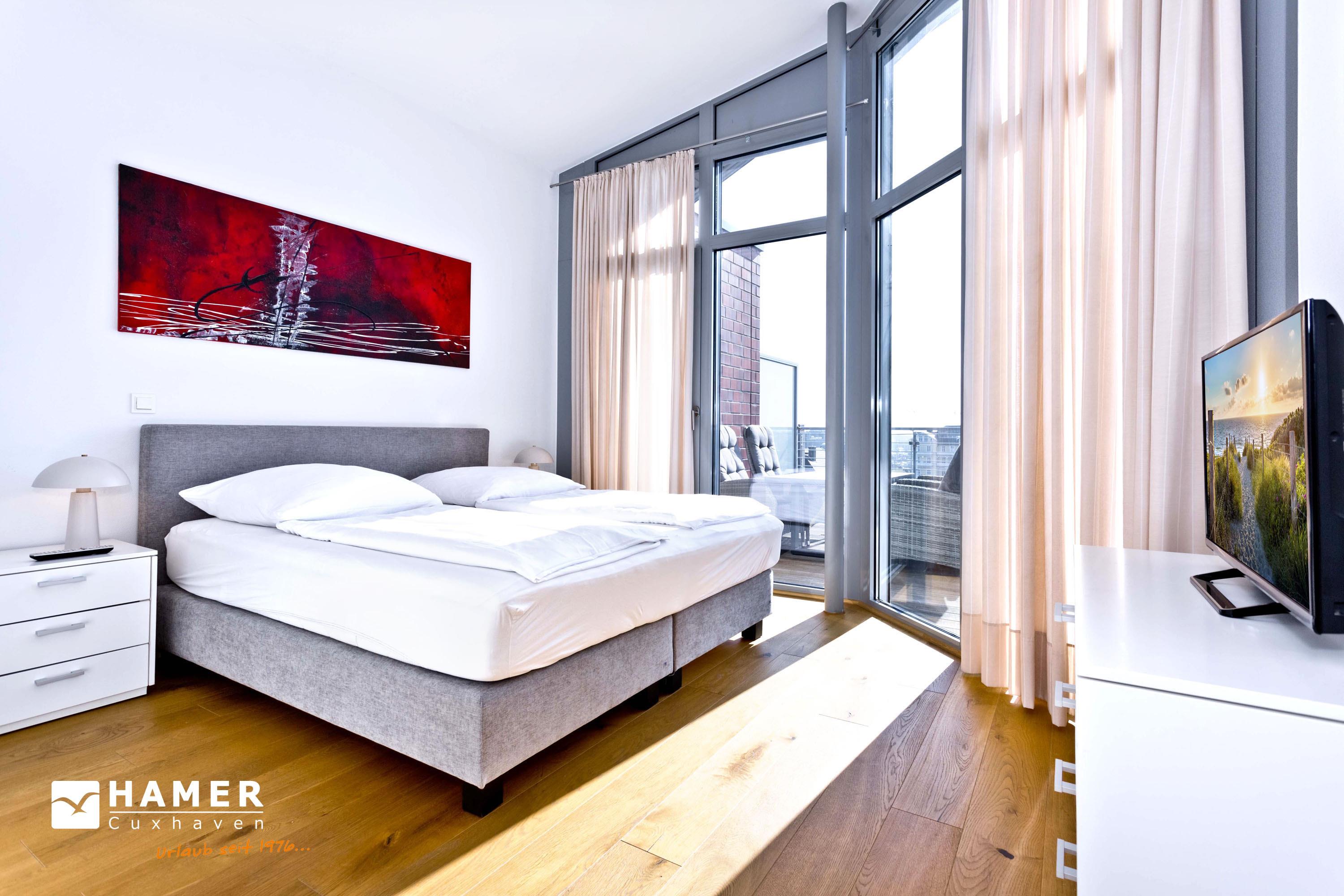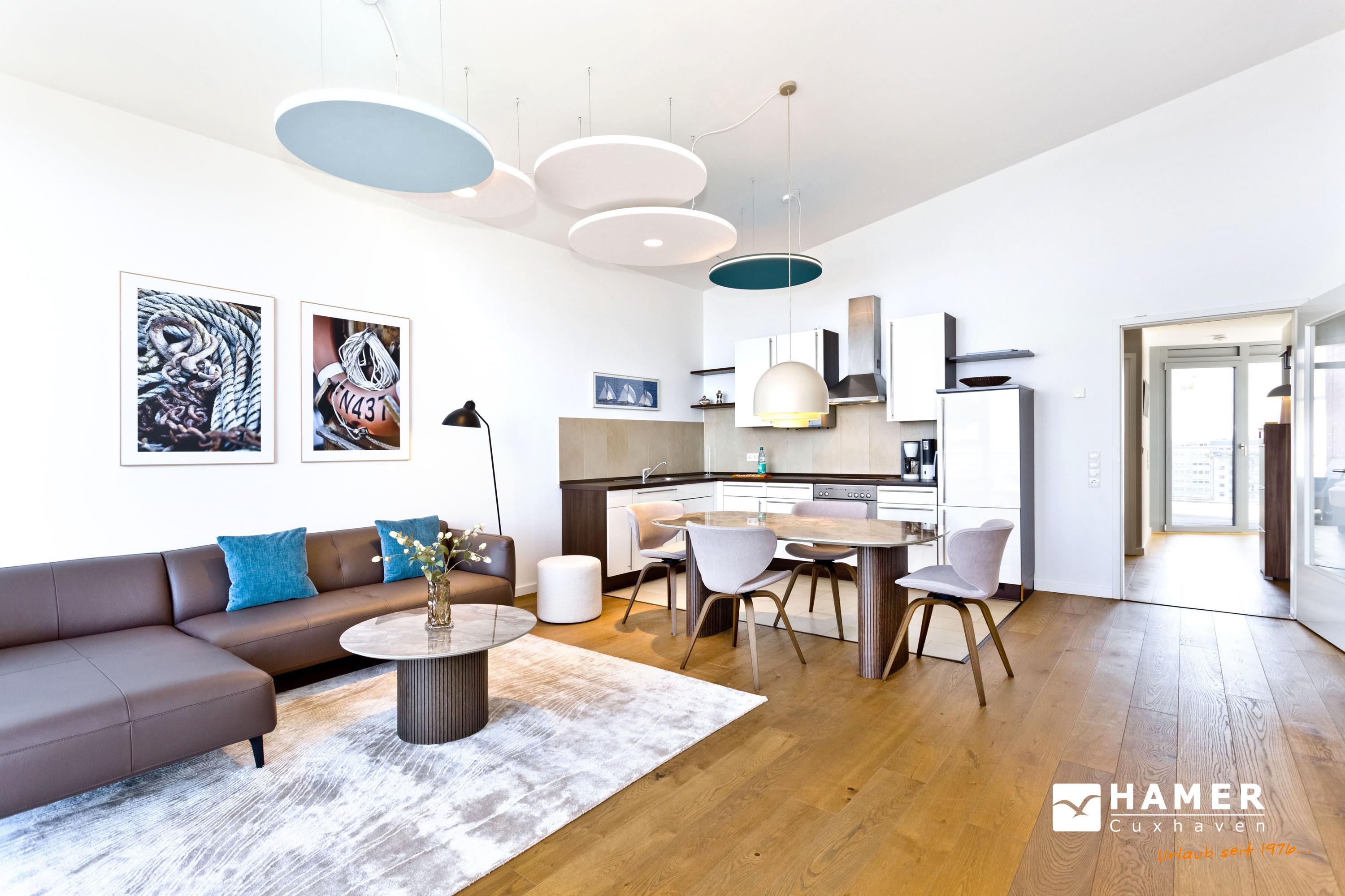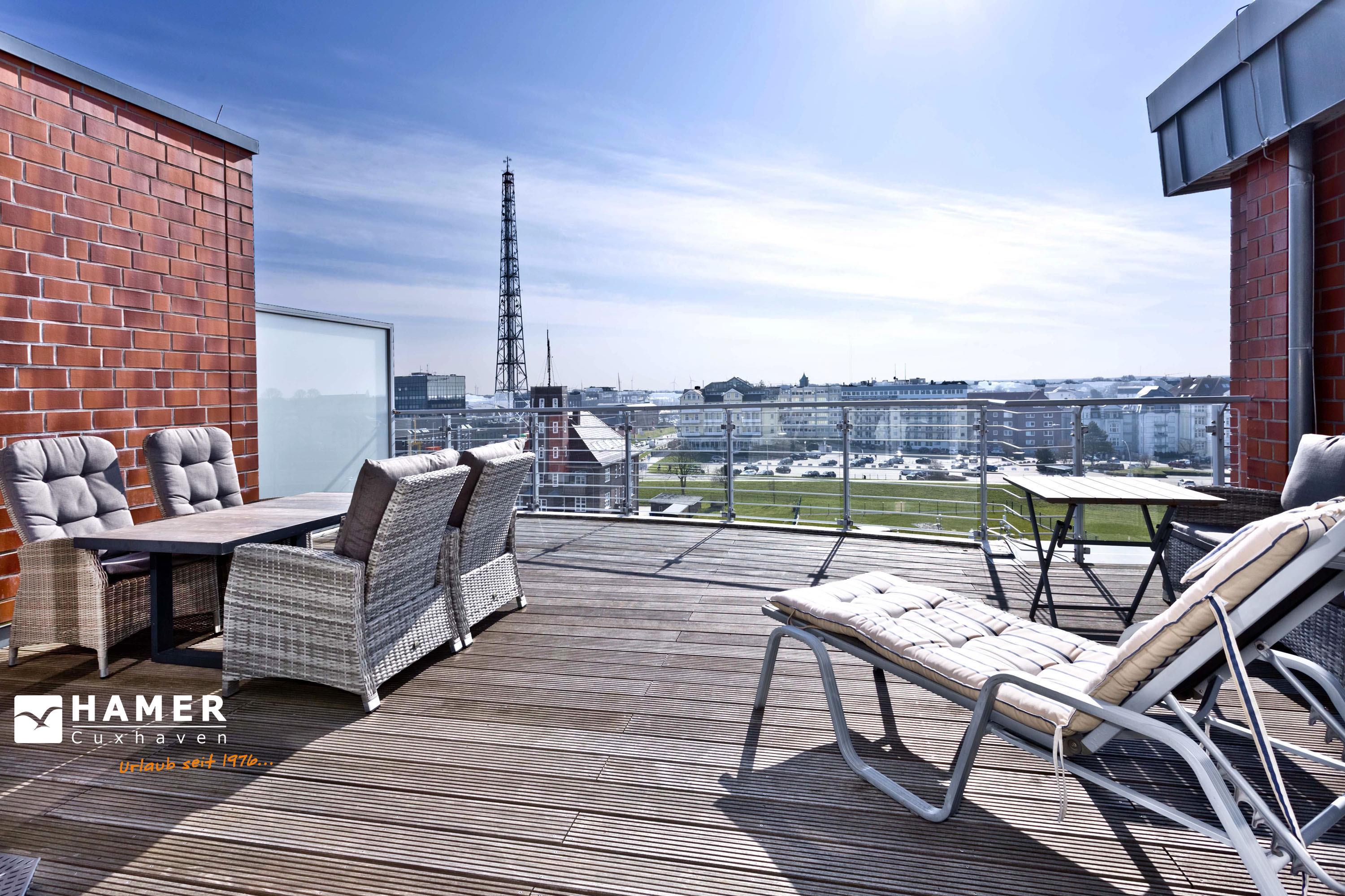 Die Penthousewohnung! 5.Etage mit dem absoluten Blick auf den Elbstrom (Die Webcam befindet sich an dieser Whg). Wohnzimmer mit Esstisch und geschmackvoller Sitzecke, TV, Stereoanlage, Balkon zur Seeseite, riesige Terrasse zur Südseite mit Blick auf den Hafen, vollständig ausgestattete Küchenzeile, Schlafzimmer mit Doppelbett (Boxspringbett), TV und elektr. Rollläden, Bad/Du/Wc mit Fön, die gesamte Wohnung ist hochwertig mit Parkett bzw. Fliesen ausgestattet, Fußbodenheizung, je ein reservierter Pkw-Stellplatz außen u. i. der Tiefgarage, keine Haustiere und natürlich Nichtraucher.