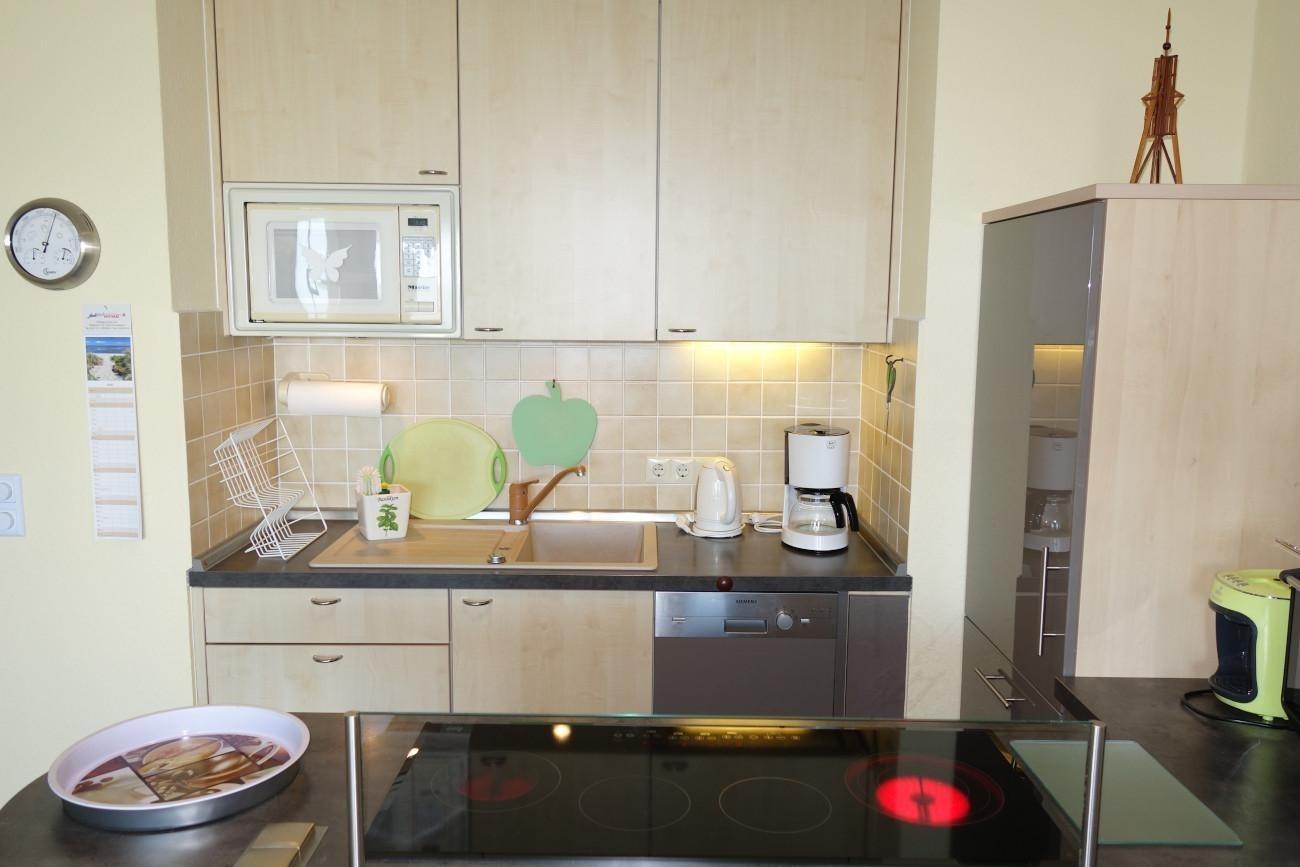 Der Wohn- und Essbereich (ca. 26 m²) ist hell und gemütlich gestaltet, ausgestattet mit Flachbild-TV, HiFi-Anlage, DVD-Player und kostenlosem WLAN. Die offene Küche bietet Ceranfeld, Mini-Backofen, Geschirrspüler, Kaffeemaschine und Wasserkocher – perfekt für selbstgekochte Mahlzeiten während Ihres Urlaubs.
