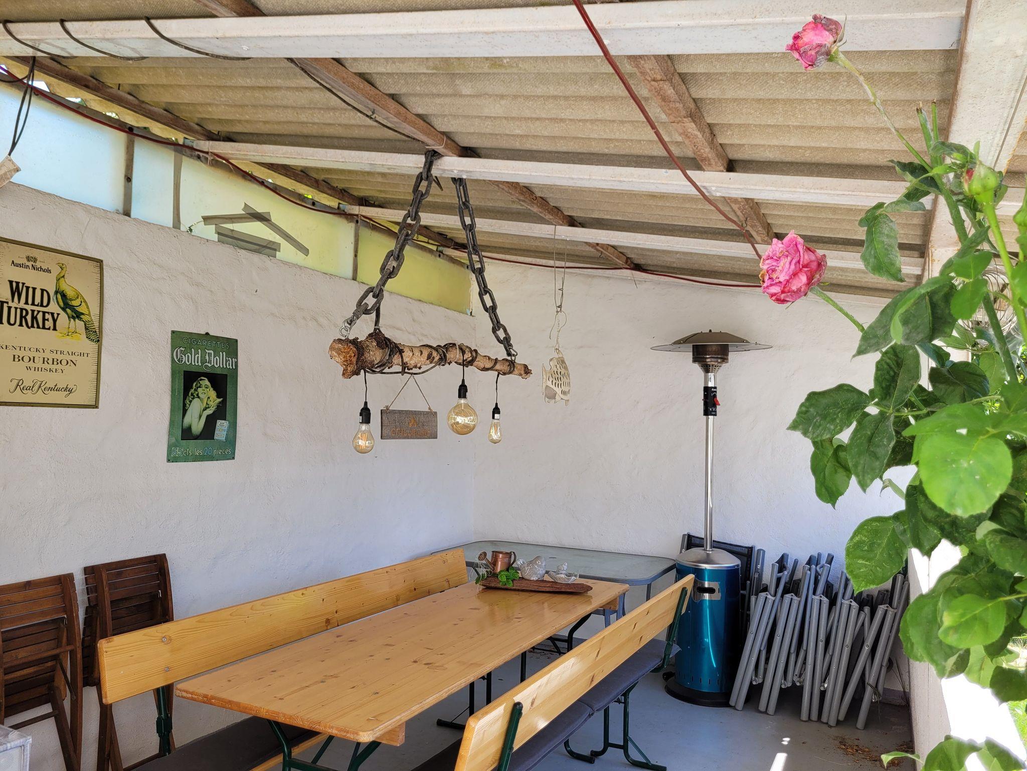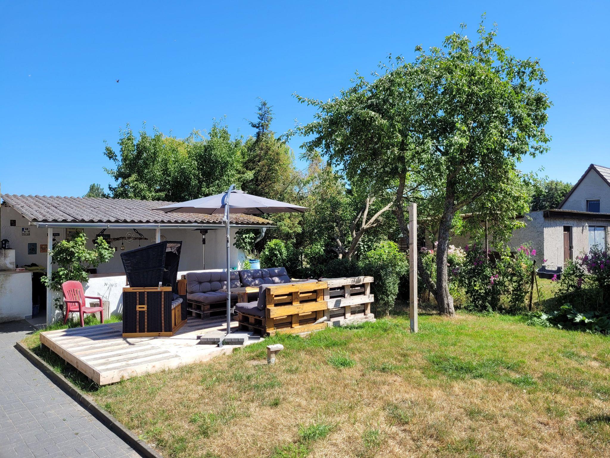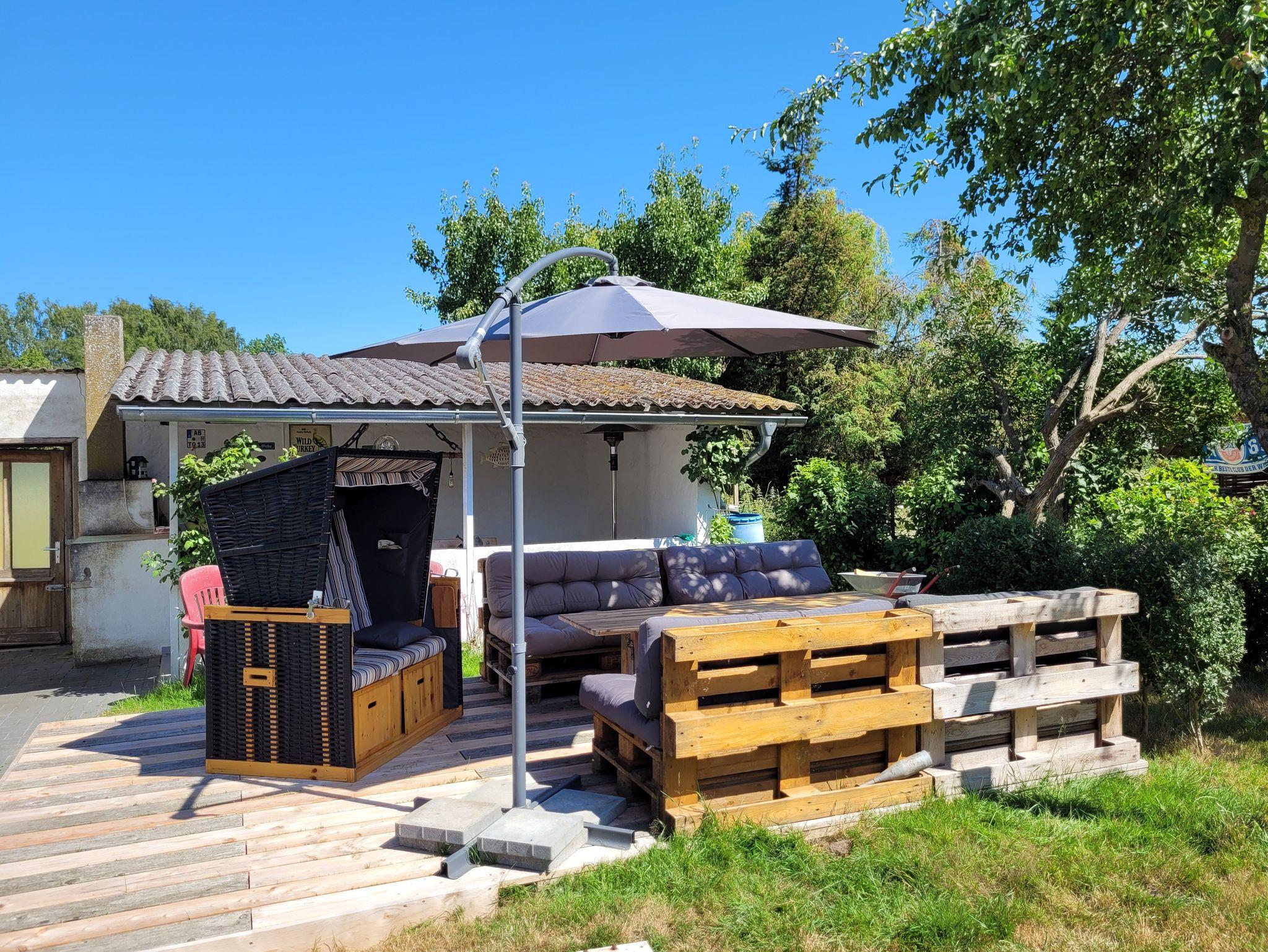 Im Garten steht eine gemütliche Terrasse mit Sitzmöbel und ein Strandkorb zur Verfügung. Sollte das Wetter mal etwas ungemütlich werden, kann zusätzlich eine überdachte Terrasse genutzt werden. Für Grillabende steht ein großer Grill bereit.