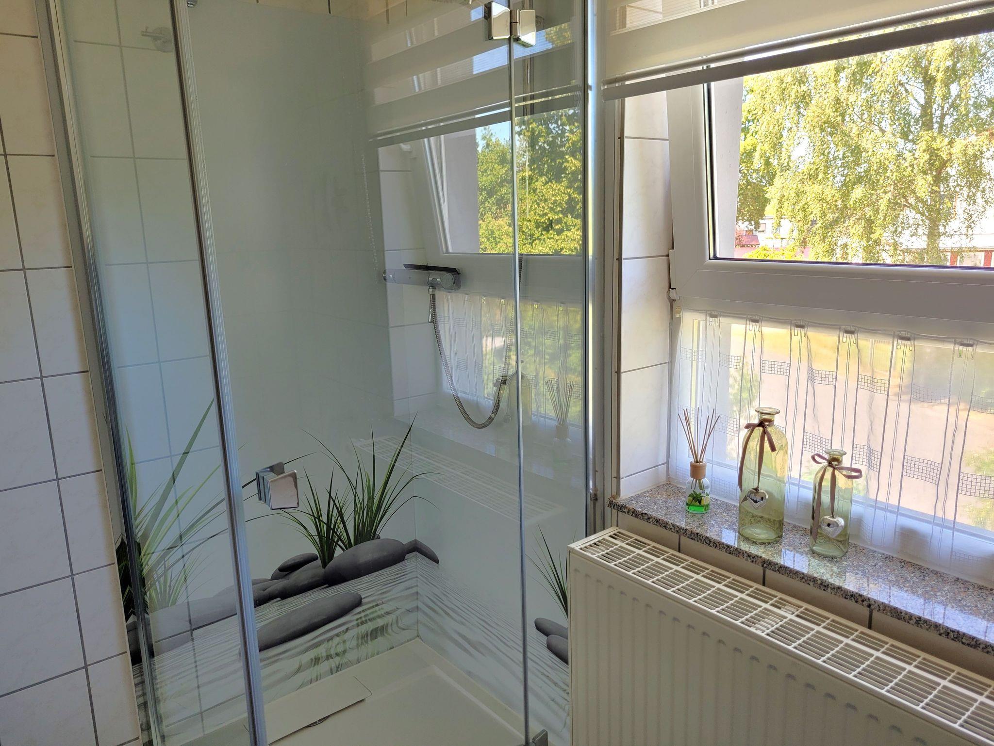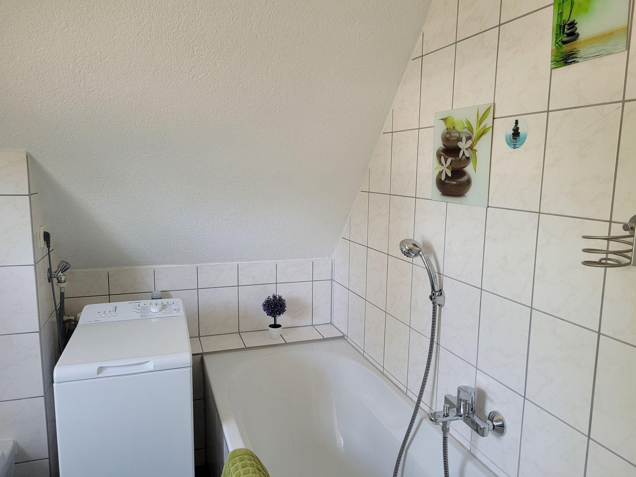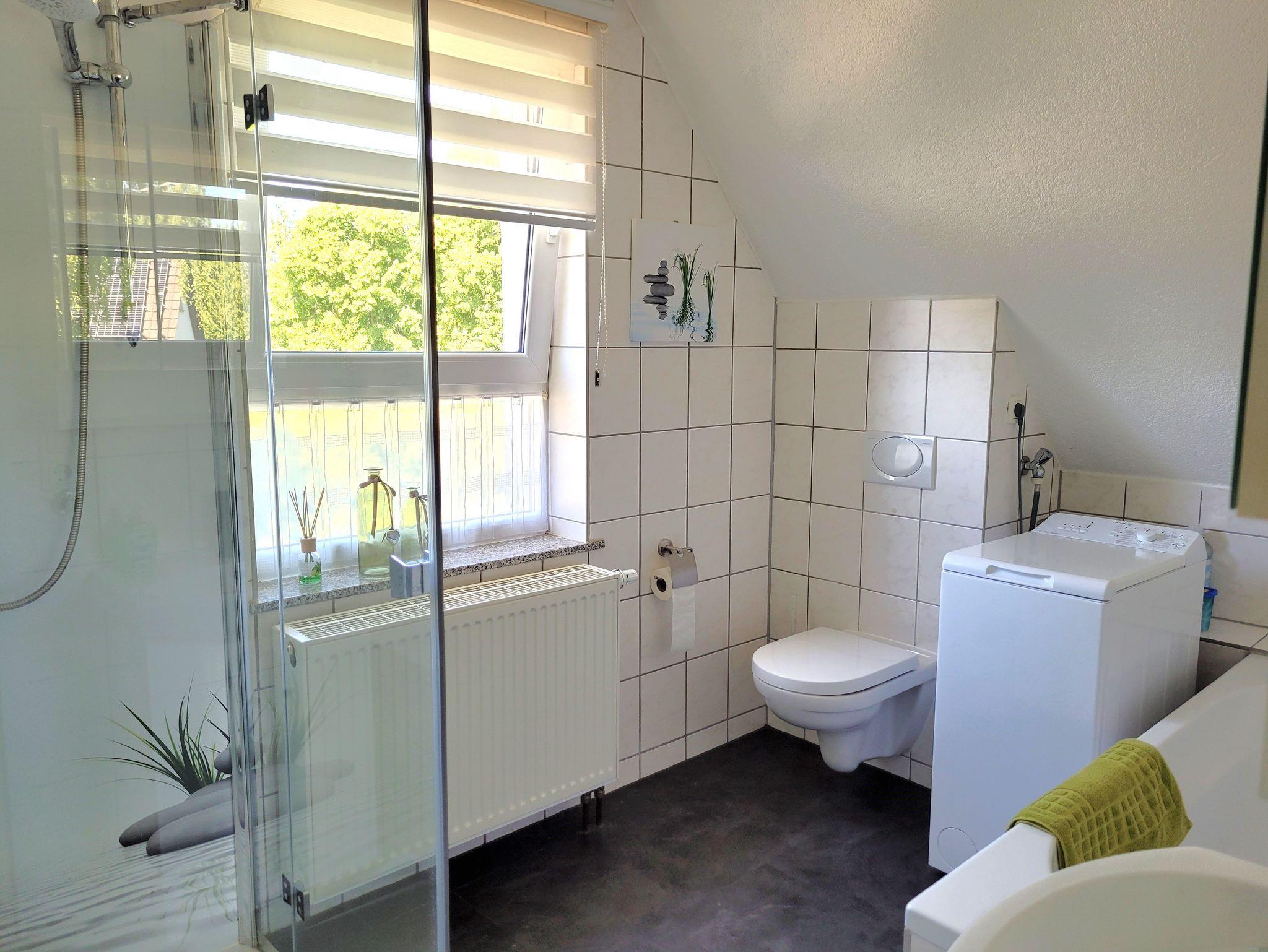 Das moderne Badezimmer verfügt über eine Dusche, eine Badewanne, eine Waschmaschine und ein WC.