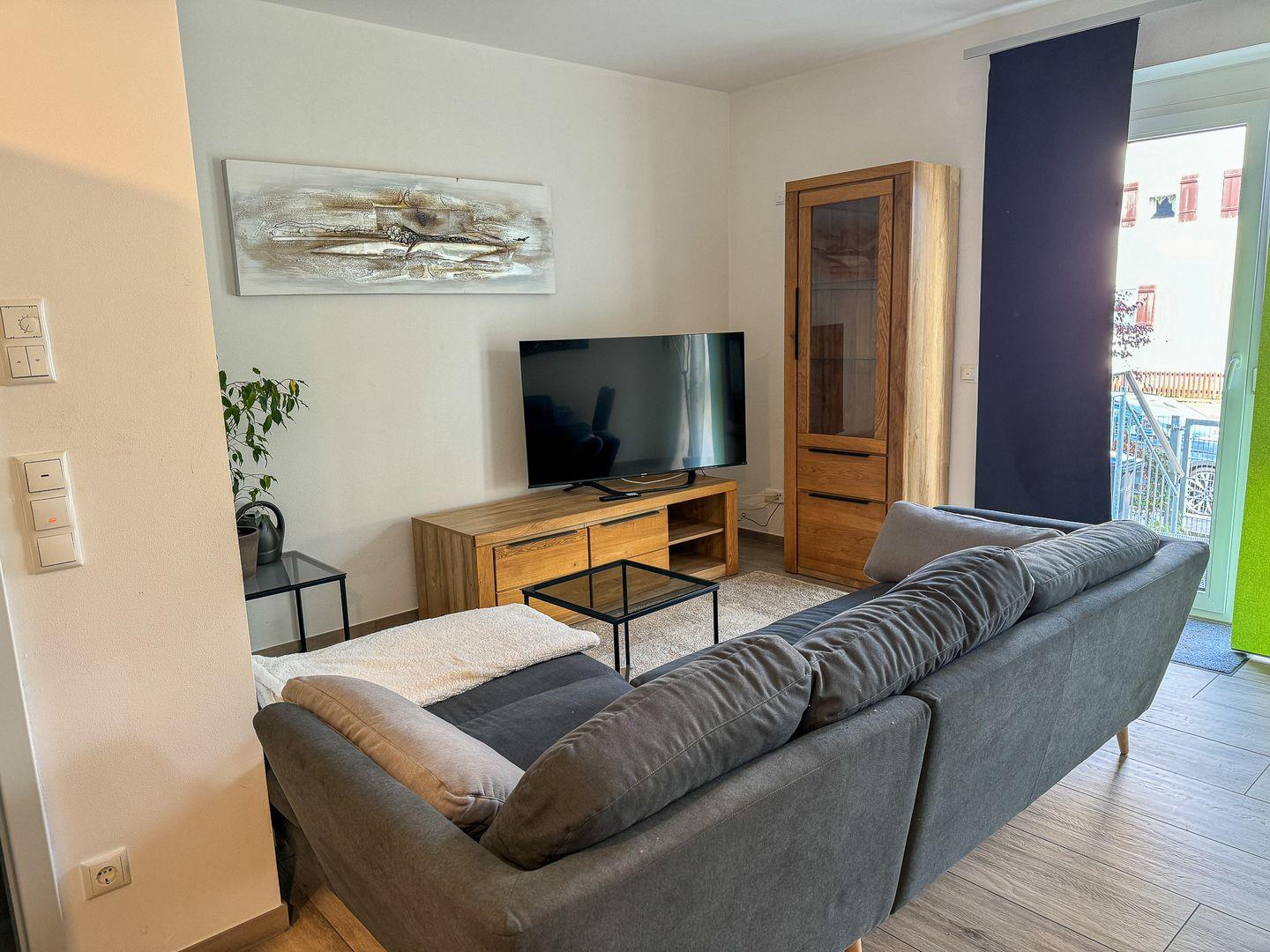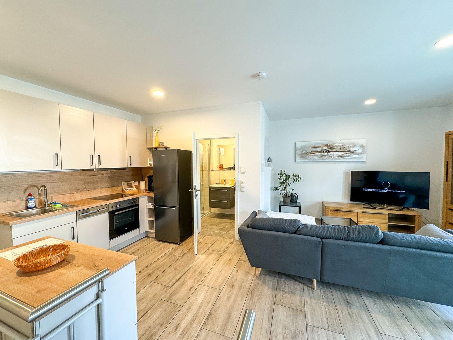 Der großzügige Wohnbereich ist offen gestaltet und mit einer modernen, großen Fensterfront versehen, sodass viel Tageslicht die Räume durchflutet. Ein bequemes Sofa, ein Esstisch sowie ein großer Fernseher (über 55 Zoll, Satellitenanschluss) schaffen eine angenehme Atmosphäre für gemeinsame Stunden. Im offen gestalteten Kochbereich können Sie auf einer modernen 4-Platten-Herdanlage, mit Backofen sowie ausreichend Küchenutensilien und Geschirr kulinarische Köstlichkeiten zubereiten. Zur Küchenausstattung zählen außerdem ein Kühlschrank mit Gefrierfach, Kaffeemaschine, Wasserkocher, Spülmaschine sowie ein großer Essbereich. Gewürze und Geschirrtücher werden bereitgestellt.