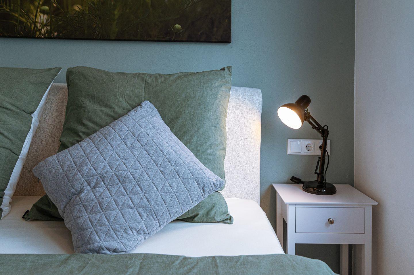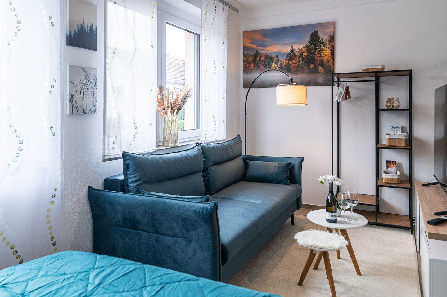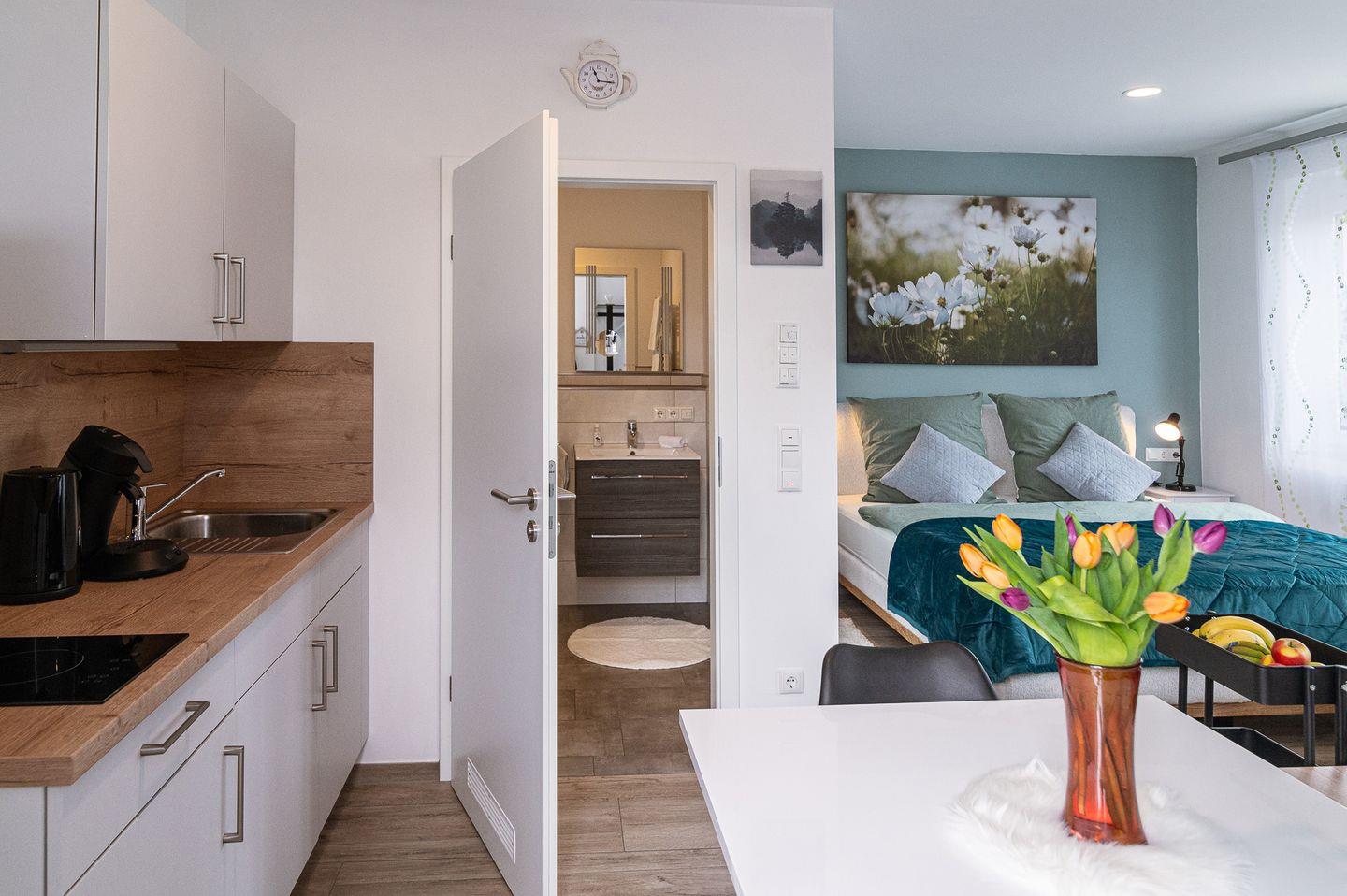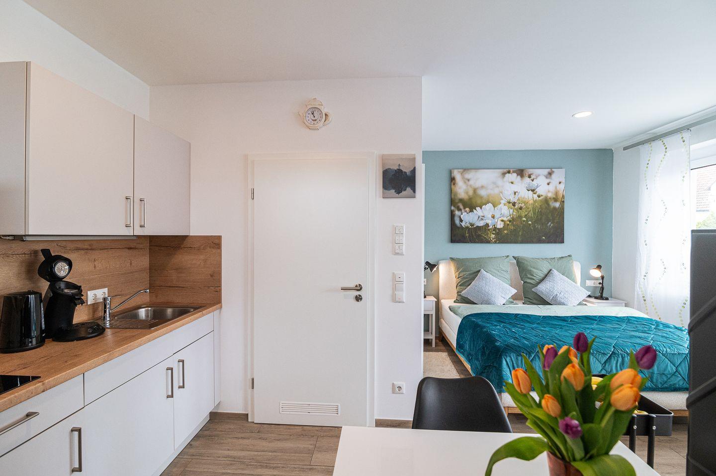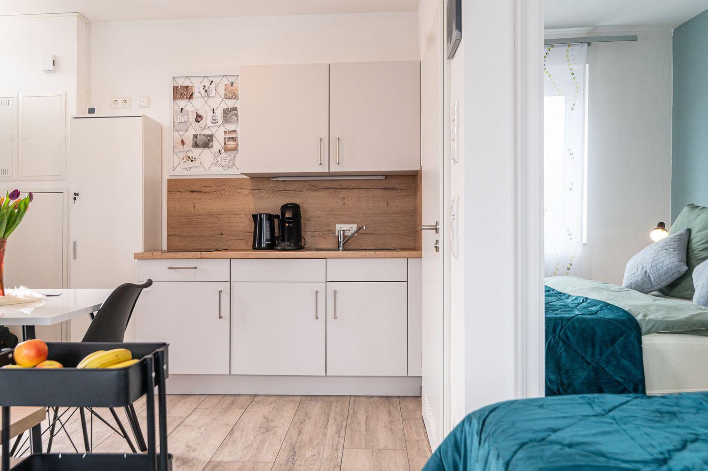 Die Unterkunft wurde zuletzt im Jahr 2023 renoviert und präsentiert sich entsprechend modern und gepflegt. Die offene Küche zum Wohnzimmer schafft ein großzügiges Raumgefühl und ist voll ausgestattet mit einem 2-Platten-Herd, Kühlschrank inklusive Gefrierfach, Kaffeemaschine (Senseo), Wasserkocher, Toaster sowie sämtlichem nötigen Geschirr, Besteck und Küchenutensilien. Basisgewürze sind vorhanden, sodass Sie Ihre Mahlzeiten komfortabel zubereiten können. Ein Esstisch sowie ein Sofa im Wohnbereich schaffen eine gemütliche Atmosphäre für gemeinsame Stunden.