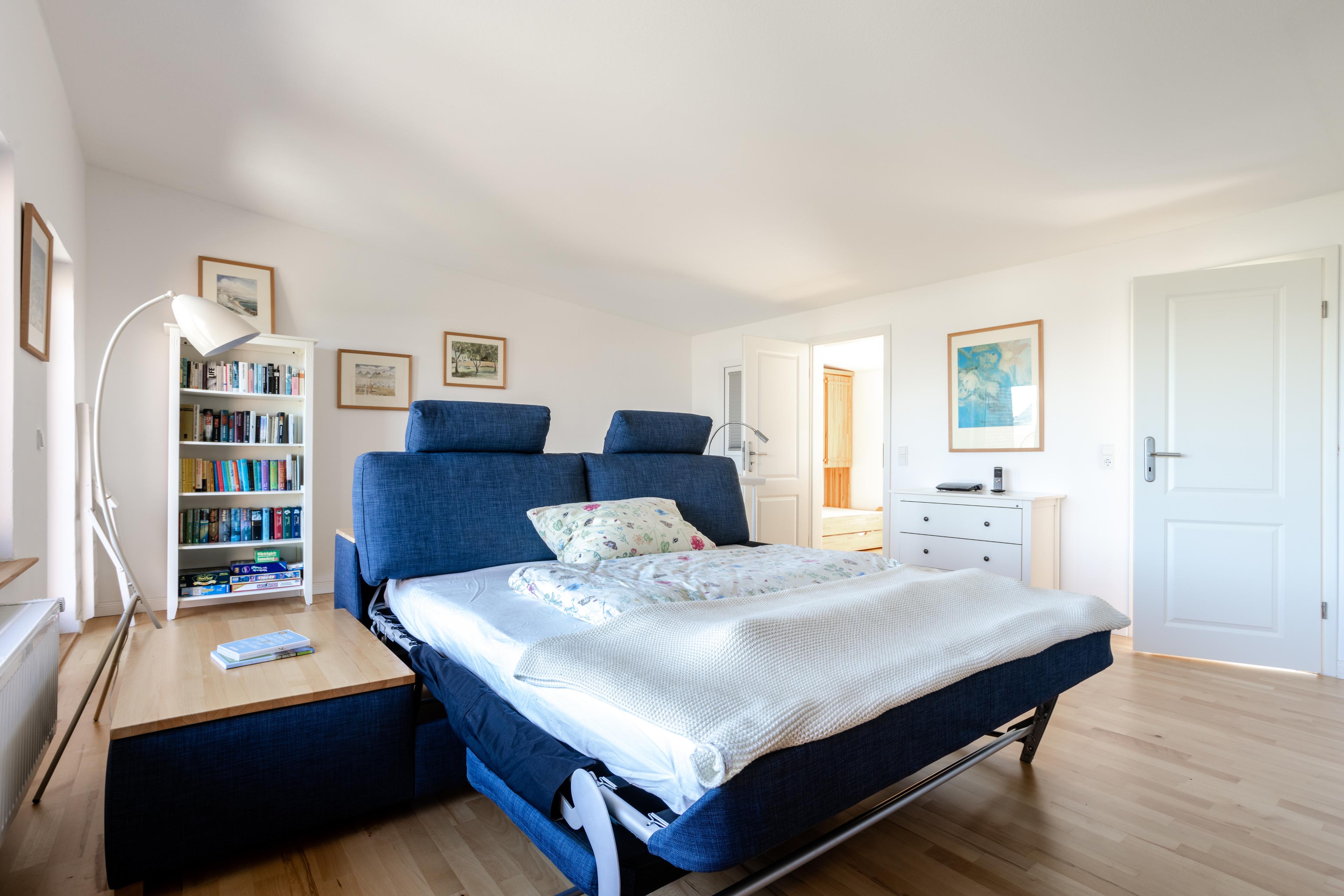 Das Haus besticht durch seine ruhige, zentrale Strandlage. Im Erdgeschoss gehen vom Flur aus ein neues, hochwertiges Duschbad mit WC und eine kleine aber vollausgestattete Küche ab. Gegenüber der Küche liegt das offene Esszimmer, hier können bis zu 6 Personen am großen Esstisch zusammensitzen. Über die Treppe gelangen Sie ins lichtdurchflutete Obergeschoss. Dort erwartet Sie eine bequeme Sitzgruppe, die sich zu einem vollwertigen Doppelbett ausklappen lässt. In der großen Bücherwand finden Sie persönlich ausgesuchte Literatur, oftmals mit Sylt-Bezug. Auch für Kinder haben wir von Harry Potter bis Astrid Lindgren eine reiche Auswahl an Büchern. Nicht nur für Regentage bieten wir außerdem eine kleine Auswahl an Gesellschaftsspielen und einen 65 Zoll Flachbildfernseher. Der 11qm große, überdachte Balkon bietet die Möglichkeit, auch bei schlechtem Wetter draußen sitzen zu können. Wlan und Festnetztelefon sind selbstverständlich vorhanden. Vom Wohn-/Schlafraum gehen noch zwei weitere kleine Schlafräume mit jeweils einem Bett ab, bei Bedarf kann noch ein Kinderbett pro Zimmer ausgezogen werden. Von den Schlafzimmern aus haben Sie Zugang zu der windgeschützten 40qm Südterrasse, die selbst bei strammeren Westwinden zum Sonnenbaden einlädt.