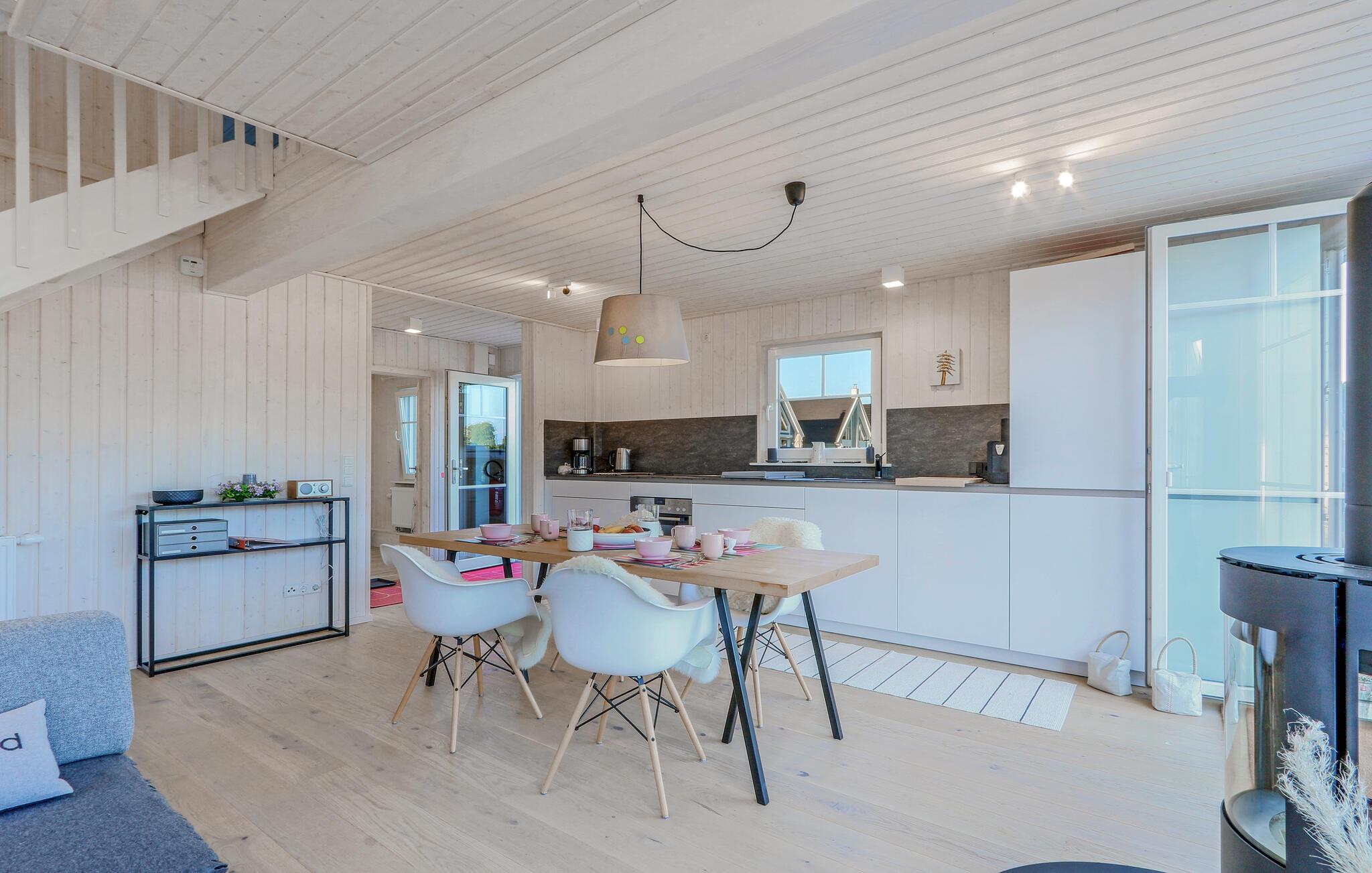 Semesterhuset är modernt och mysigt inrett i skandinavisk stil för 4 gäster. Ekparkettgolvet i vardagsrummet/matsalen understryker husets högkvalitativa inredning. Från det stora, ljusa duschrummet sveper din utsikt över ängen och hamnbyn långt in i fjärran. Det öppna köket i vardagsrummet/matsalen inbjuder till att dröja kvar med sitt stora mysiga träbord. Från den galleriaklädda första våningen har du också en spektakulär utsikt över vattnet och tack vare de stora panoramafönstren faller utsikten över vattnet och den vackra naturen redan från din säng på morgonen. Njut av de vackra omgivningarna och den friska luften när som helst på året. På vintern, efter en promenad längs den iskalla sjön eller genom de snötäckta skogarna, kan du värma dig igen framför den mysiga sprakande öppna spisen i vardagsrummet.