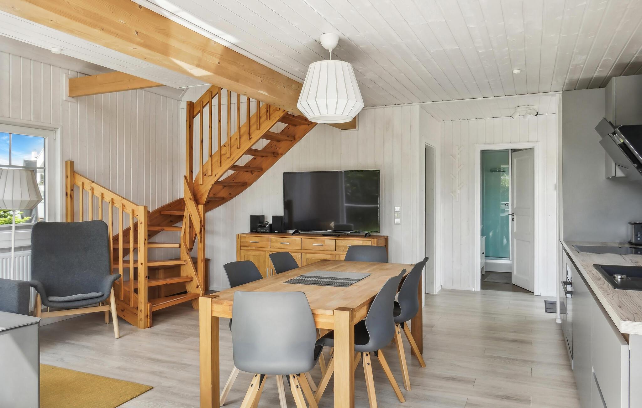 Semesterhuset har ett lugnt läge i semesterbyn med en vacker utsikt över ängar och fält. Tack vare den gallererade första våningen och panoramafönstren som sträcker sig från golvet till taket är huset särskilt ljust och vänligt. De två separata sovrummen är utrustade med varsin mysig dubbelsäng. Det finns plats för en resesäng för barn i båda sovrummen. Denna och en barnstol för barn finns i huset. Alla fönster och altandörren har professionella insektsskydd som kan öppnas.