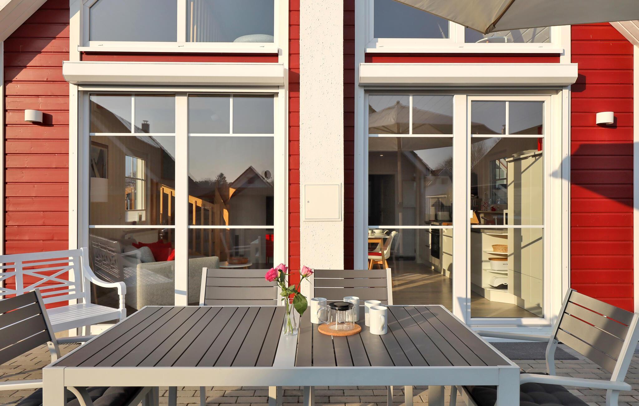 Men det är inte bara i huset som du kan tillbringa underbara timmar. Under varma sommardagar erbjuder terrassen med högkvalitativa trädgårdsmöbler en underbar plats för avkoppling. Här kan du äta en mysig frukost och laga läckra måltider på grillen.