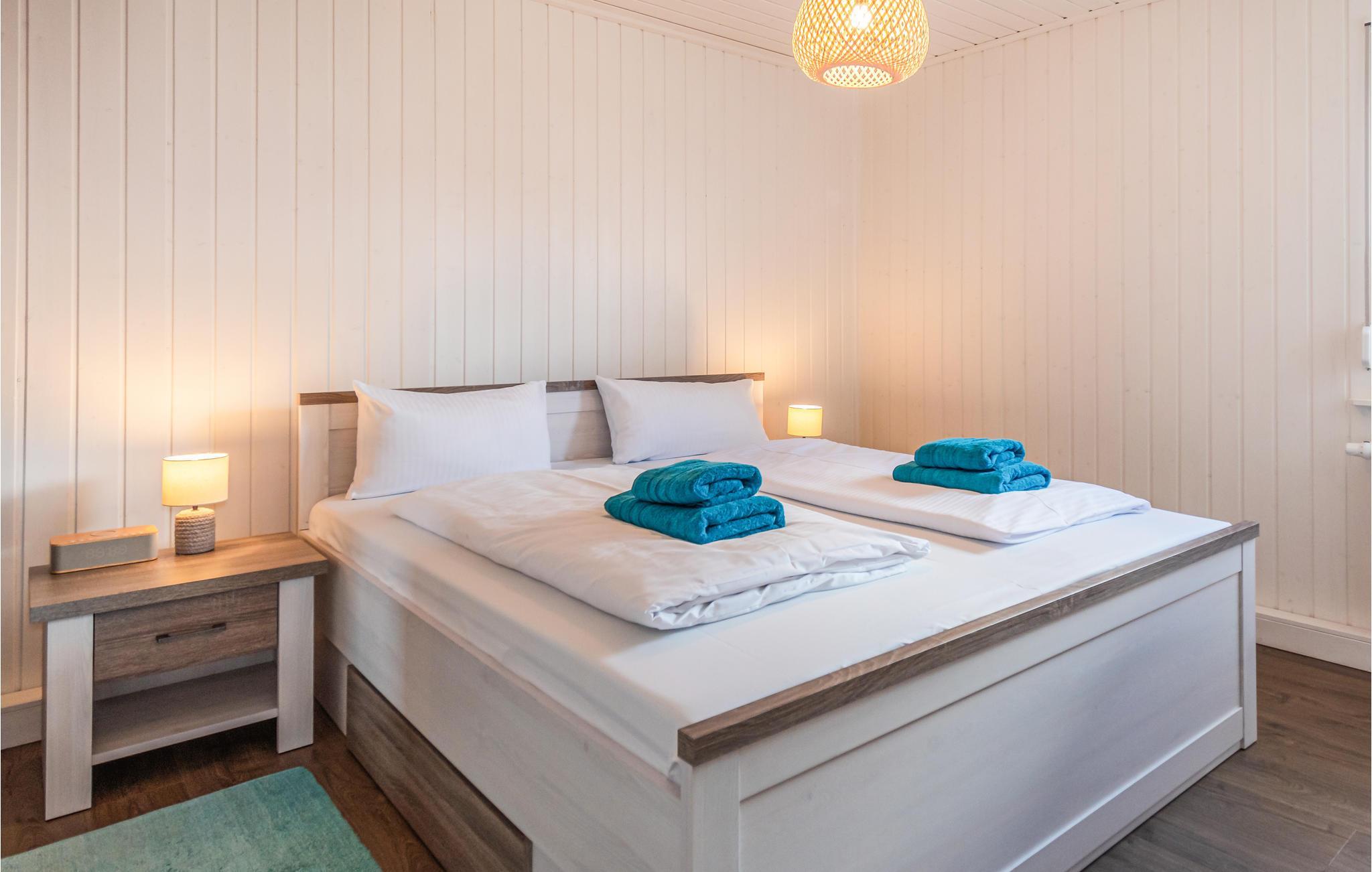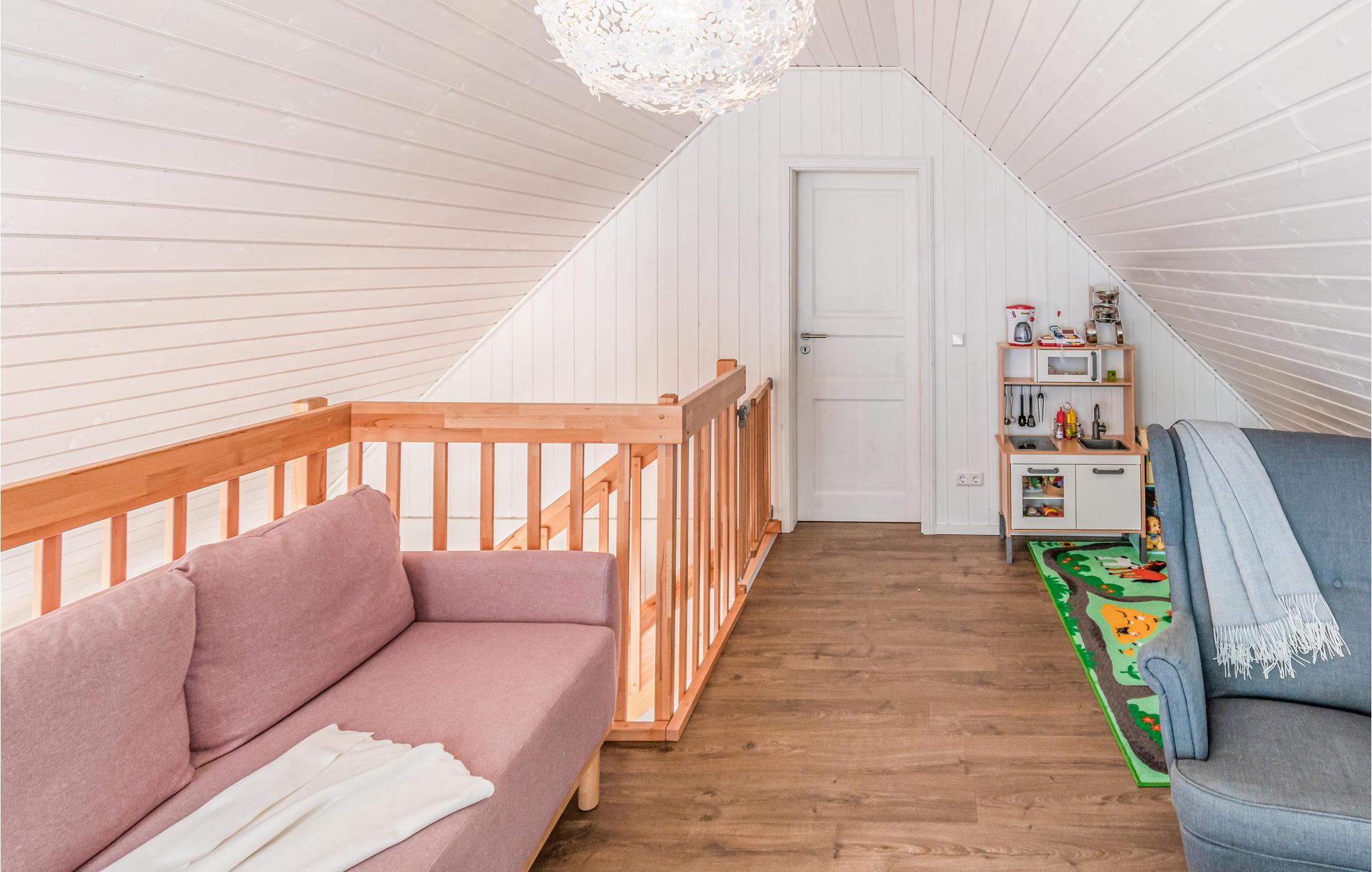 Tack vare den galleriakomplexade första våningen och panoramafönstren som sträcker sig från golvet till taket är huset särskilt ljust och vänligt. Sovrummet på bottenvåningen är utrustat med en dubbelsäng, medan sovrummet på övervåningen har två enkelsängar. Det finns plats för en resesäng för barn i båda sovrummen. Denna och en barnstol finns i huset.