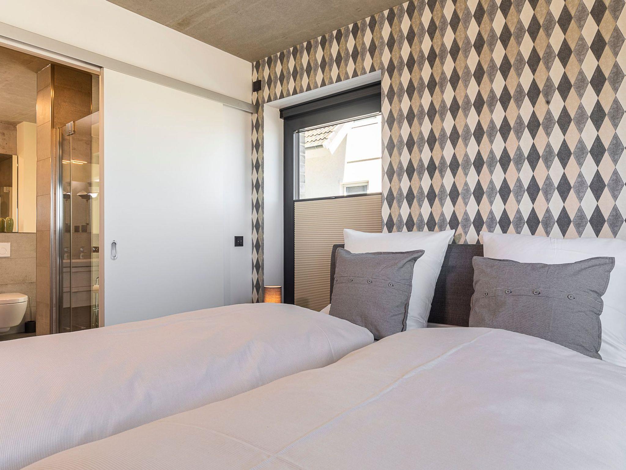 Diese 3-Zimmer-Wohnung besticht durch eine zeitlos elegante Einrichtung (Design-Pandomo-Fußboden). Das helle Wohnzimmer mit Flachbild-TV und einer komplett ausgestatteten Küchenzeile eignet sich für einen komfortablen Urlaub. Zwei stylische Schlafzimmer verfügen über ein Bad en Suite. Das erste Schlafzimmer ist mit einem Boxspringbett (1,80 x 2,00 m), mit durchgehender Matratze (der Firma Jensen), einem Kleiderschrank sowie TV ausgestattet, das zweite Schlafzimmer mit einem Boxspringbett (1,80 x 2,10m), mit zwei geteilten Matratzen (der Firma Jensen), einem Kleiderschrank sowie TV. Die Bäder sind mit einer bodengleichen Dusche / Regendusche sowie einem Handtuchheizkörper ausgestattet. Auf der Terrasse genießen Sie die Morgen- und Mittagssonne und als besonderes Bonbon steht Ihnen hier ein Strandkorb zur Verfügung. Zur komfortablen und sicheren Unterbringung Ihres PKWs steht Ihnen ein Außenstellplatz direkt am Haus zur Verfügung. Ebenso im Haus steht ein Gemeinschaftsraum mit Waschmaschine und Trocknerb bereit, die über einen Münzzähler bedient werden. Auch Fahrräder können sicher im abschließbaren Fahrradraum untergestellt werden.