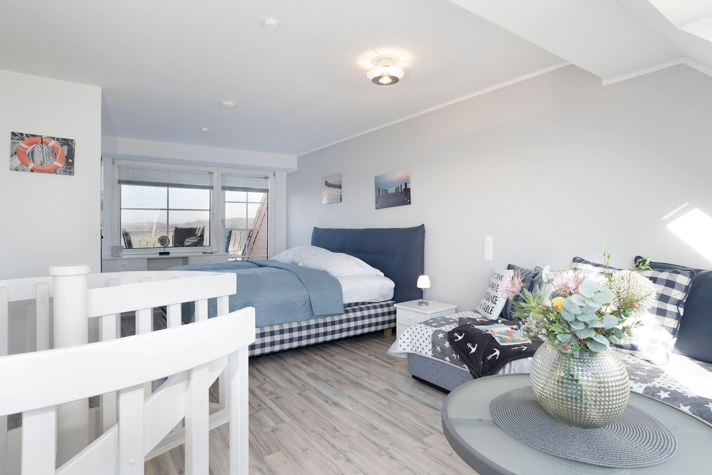 Der freundlich helle Wohnbereich lädt mit großer Couch zum Kuscheln vor dem Fernseher ein. Von hier gelangen Sie auf den Balkon, auf dem Sie schon morgens beim Frühstück den fantastischen Blick auf das Meer genießen können. Dank der gut ausgestatteten Küche können Sie selbst entscheiden, ob Sie das tolle kulinarische Angebot der Region nutzen oder sich doch lieber selbst versorgen möchten. Nach einem ereignisreichen Urlaubstag entspannen Sie im Doppelbett (2x 90x200 cm) im separaten Schlafzimmer. Auf dieser Etage befindet sich außerdem ein Duschbad. Über eine Wendeltreppe erreichen Sie das OG, wo ein weiteres Schlafzimmer mit Doppelbett (2x 90x200 cm) wartet. Genießen Sie nach dem Aufwachen die gute Ostseeluft auf einem eigenen kleinen Balkon. Auch diese Etage verfügt über ein Duschbad.