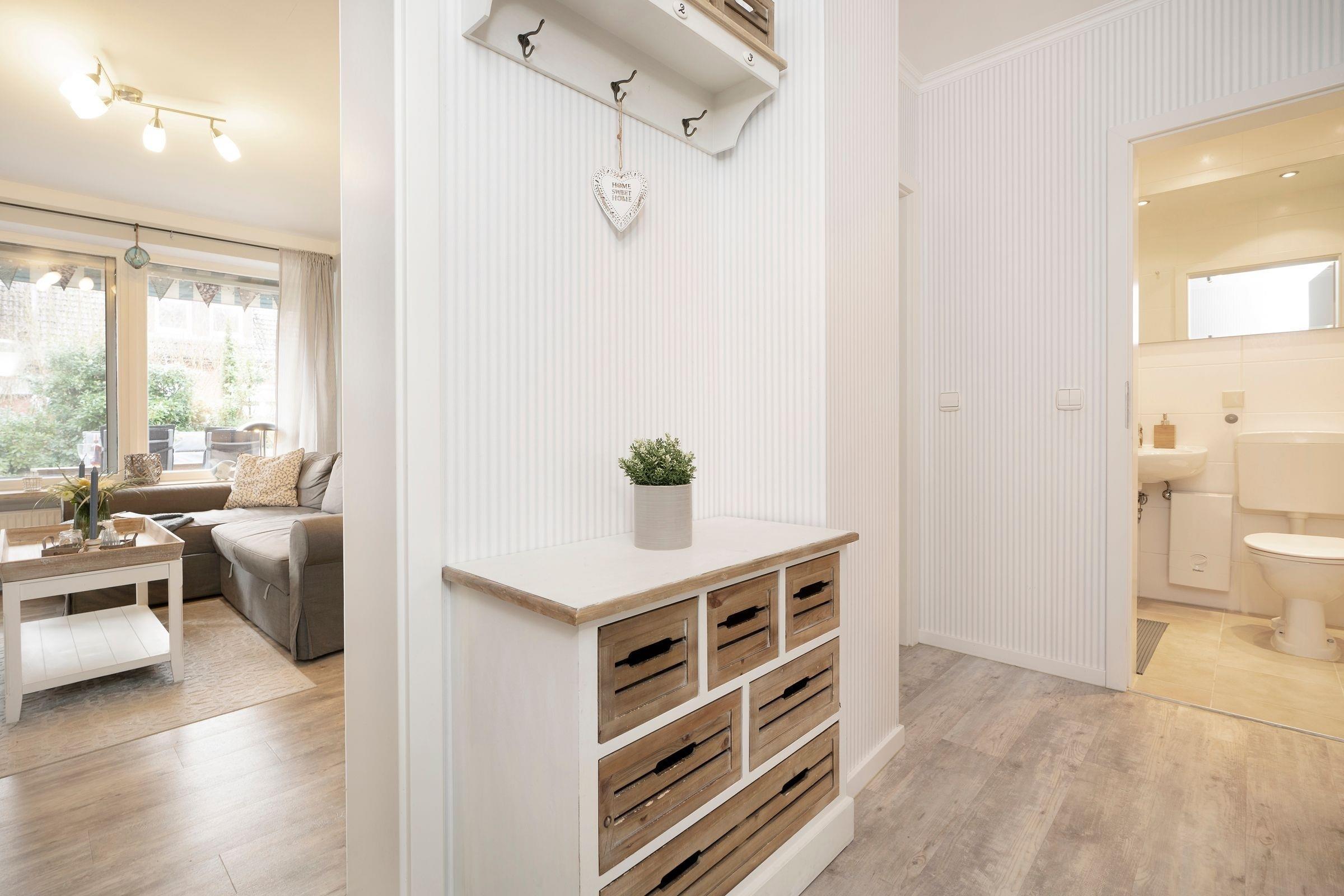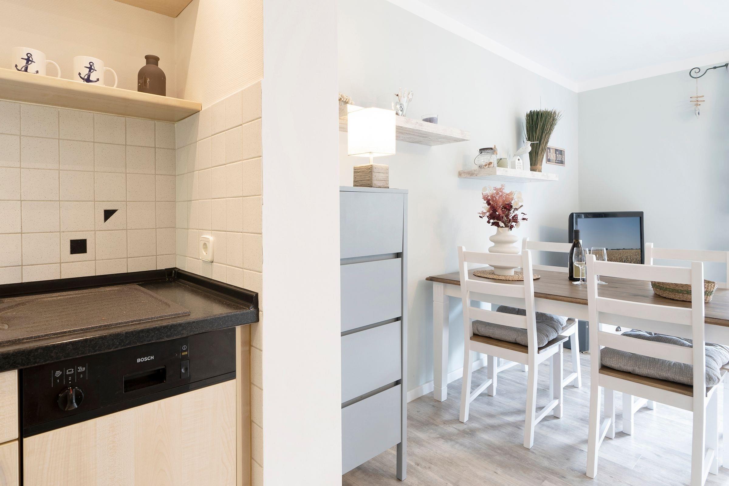 Hell und modern empfängt Sie Ihr Urlaubsdomizil mit dem geräumigen Wohnbereich. Die große Couch kann bei Bedarf in einen weiteren Schlafplatz (160x200 cm) verwandelt werden. Highlight dieser Unterkunft ist die ca. 20 m² große Südterrasse mit Strandkorb und kleinem Gartenstück zur Eigennutzung. Die in den Wohnbereich integrierte Küche ist mit allem ausgestattet, was Sie zum Zubereiten Ihrer Mahlzeiten benötigen. Diese können Sie anschließend am angrenzenden Esstisch gemeinsam einnehmen.