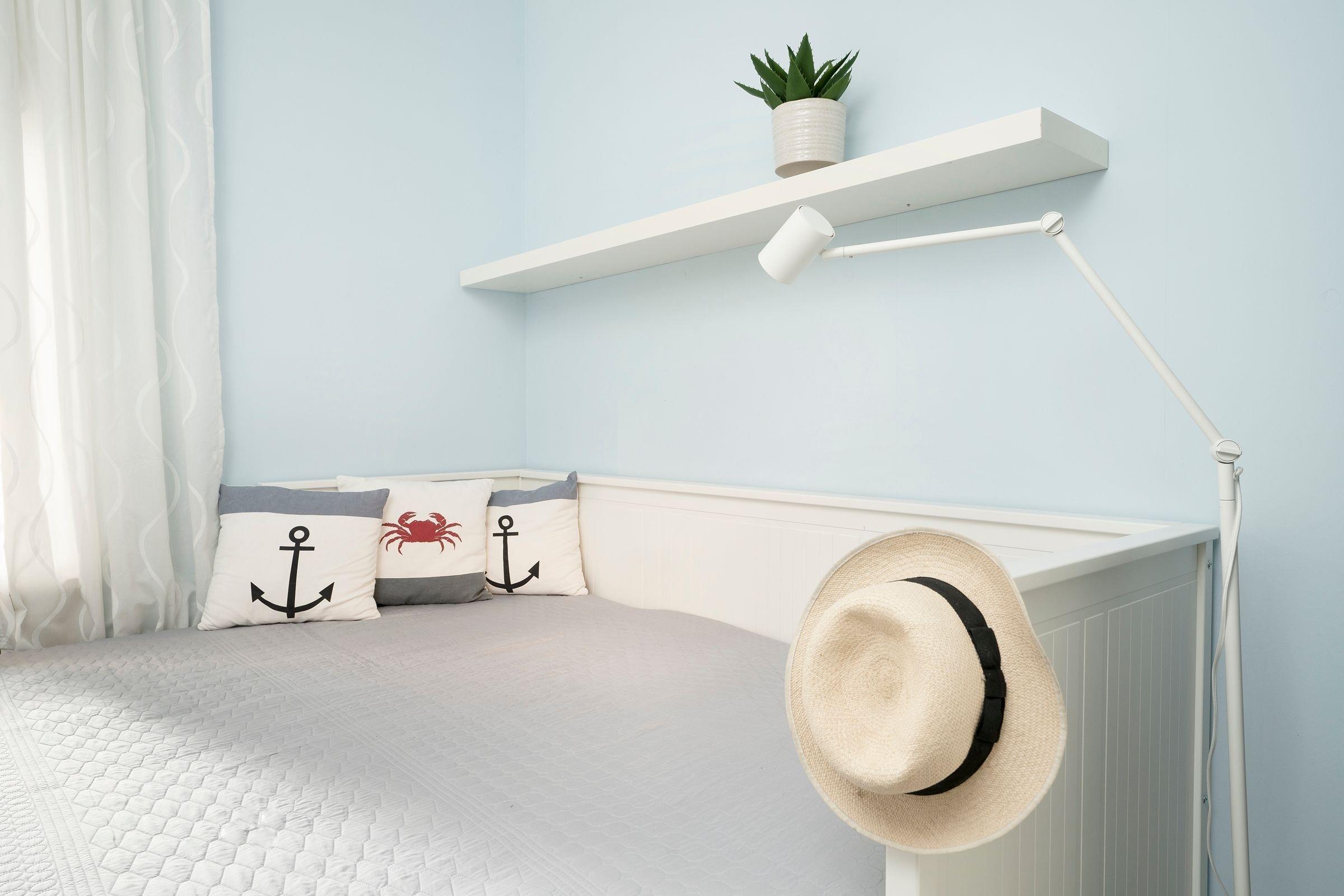 Schlafzimmer 1: 1 Boxspringbett (180x200 cm), Kleiderschrank, Verdunkelung: blickdichte Vorhänge, Rolladen, kein Platz für ein Babybett