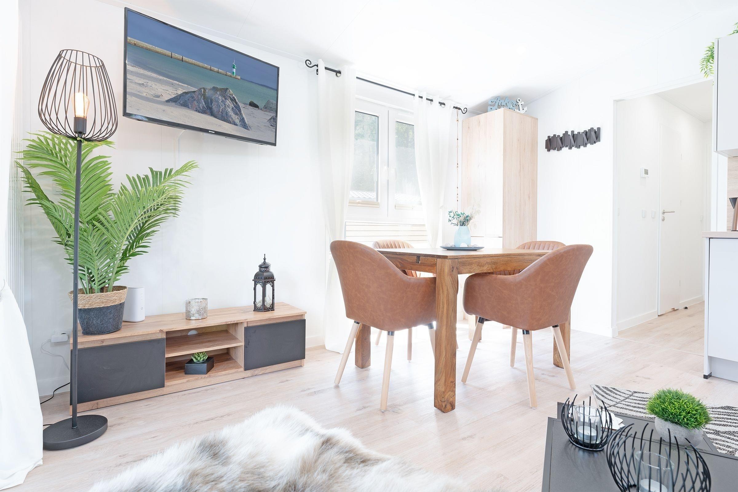 Der offene Wohnraum mit Sofa, Essplatz und Küche überzeugt durch seine geschmackvolle Einrichtung. Von hier aus gelangen Sie auf die gemütliche, teilüberdachte Terrasse, die besonders abends der perfekte Ort für einen stimmungsvollen Ausklang eines ereignisreichen Urlaubstages ist. Dieses Feriendomizil ist komplett umzäunt und ermöglicht auch Vier- und kleinen Zweibeinern einen entspannten Urlaub.