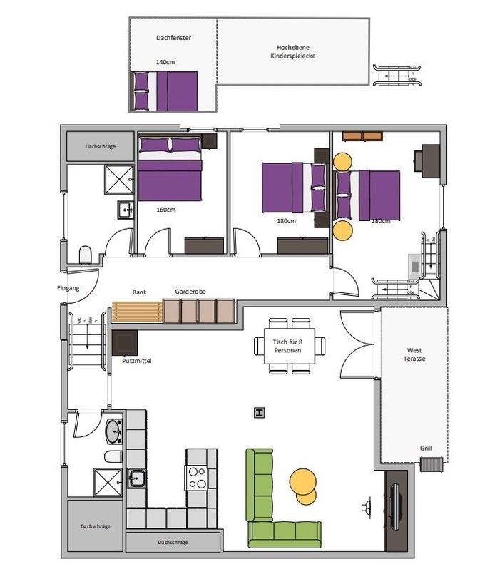 Vom hellen, charmanten Wohnbereich, dem es mit TV, Bluetooth-Audiobox und einer Essecke an nichts fehlt, gelangen Sie direkt auf den möblierten Balkon mit Gasgrill. Die gut ausgestattete, moderne Küche mit Induktionsherd, Spülmaschine und Espressomaschine (Nespresso) fügt sich hervorragend in den Raum ein und lädt dazu ein, regionale Zutaten in köstliche Gerichte zu verwandeln. Im größten Schlafzimmer befindet sich ein Boxspringbett (180x200 cm). Auf der Hochebene dieses Schlafzimmers, welche Sie über eine Treppe erreichen können, entdecken Sie eine kleine Spielecke sowie ein kleines Doppelbett (140x200 cm) für bis zu 2 Kinder. Das 2. Schlafzimmer ist mit einem Boxspringbett (180x200 cm) und einer Kommode ausgestattet. Im kleinsten der Schlafzimmer empfängt Sie ein gemütliches Doppelbett (160x200 cm) und ebenfalls eine Kommode. Die beiden Duschbäder sind mit einer Fußbodenheizung ausgestattet.