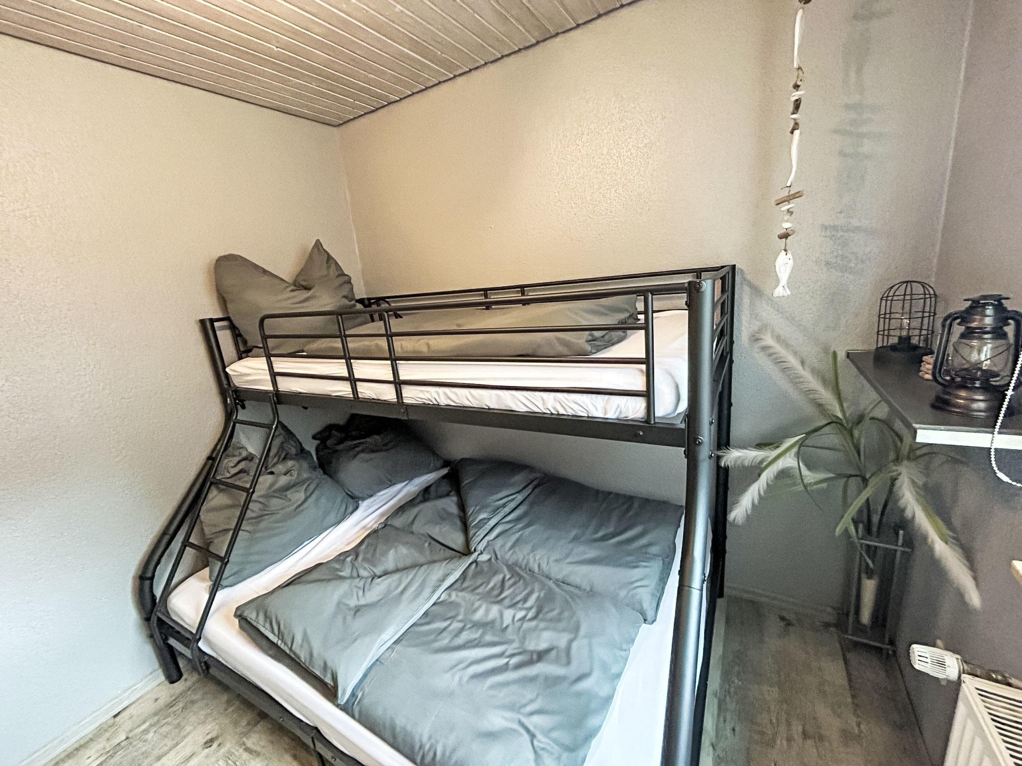 "Nobby", 3-room terraced house 50 m2. Object suitable for 2 adults + 3 children. Cosy furnishings: living/dining room with dining table and satellite TV (flat screen). Exit to the terrace. 1 room with 1 bed (180 cm, length 200 cm). 1 room with 1 x 2 bunk beds. Kitchen (oven, dishwasher, 4 ceramic glass hob hotplates, toaster, kettle, microwave, electric coffee machine). Shower/WC. Terrace, lawn. Terrace furniture. Facilities: children's high chair, baby cot for up to 2 year olds. Internet (WiFi, free). Please note: non-smoking house. Maximum 2 pets/ dogs allowed. Smoke alarm. Il letto a castello ha una dimensione di 90 cm x 200 cm nella parte superiore e una dimensione di 140 cm x 200 cm nella parte inferiore.