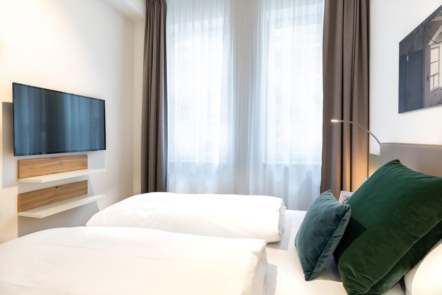 Das helle und moderne Nichtraucher-Apartment verfügt über Fußbodenheizung, bodentiefe Fenster, kostenfreies WLAN und eine voll ausgestattete offene Küche mit Geschirrspüler, Kühlschrank, einen Herd mit 2 Glaskeramikkochfeldern und Backofen, Kaffeemaschine, Toaster, Wasserkocher und Mixstab. Im separaten Schlafzimmer befindet sich ein komfortables Boxspring-Doppelbett (1,80 x 2,00 m) und ein Flatscreen-TV (40 Zoll). Im kombinierten Wohn-Essbereich stehen euch ein Flatscreen-TV (40 Zoll) und eine Musikanlage sowie eine Einzelschlafcouch (1,20 x 1,95 m) zur Verfügung. Das Apartment verfügt über einen Safe für Laptopgröße bis ca. 17 Zoll. Im modernen Badezimmer befinden sich eine ebenerdige Regendusche, ein Waschtisch, WC, ein Handtuchwärmer sowie ein Föhn.