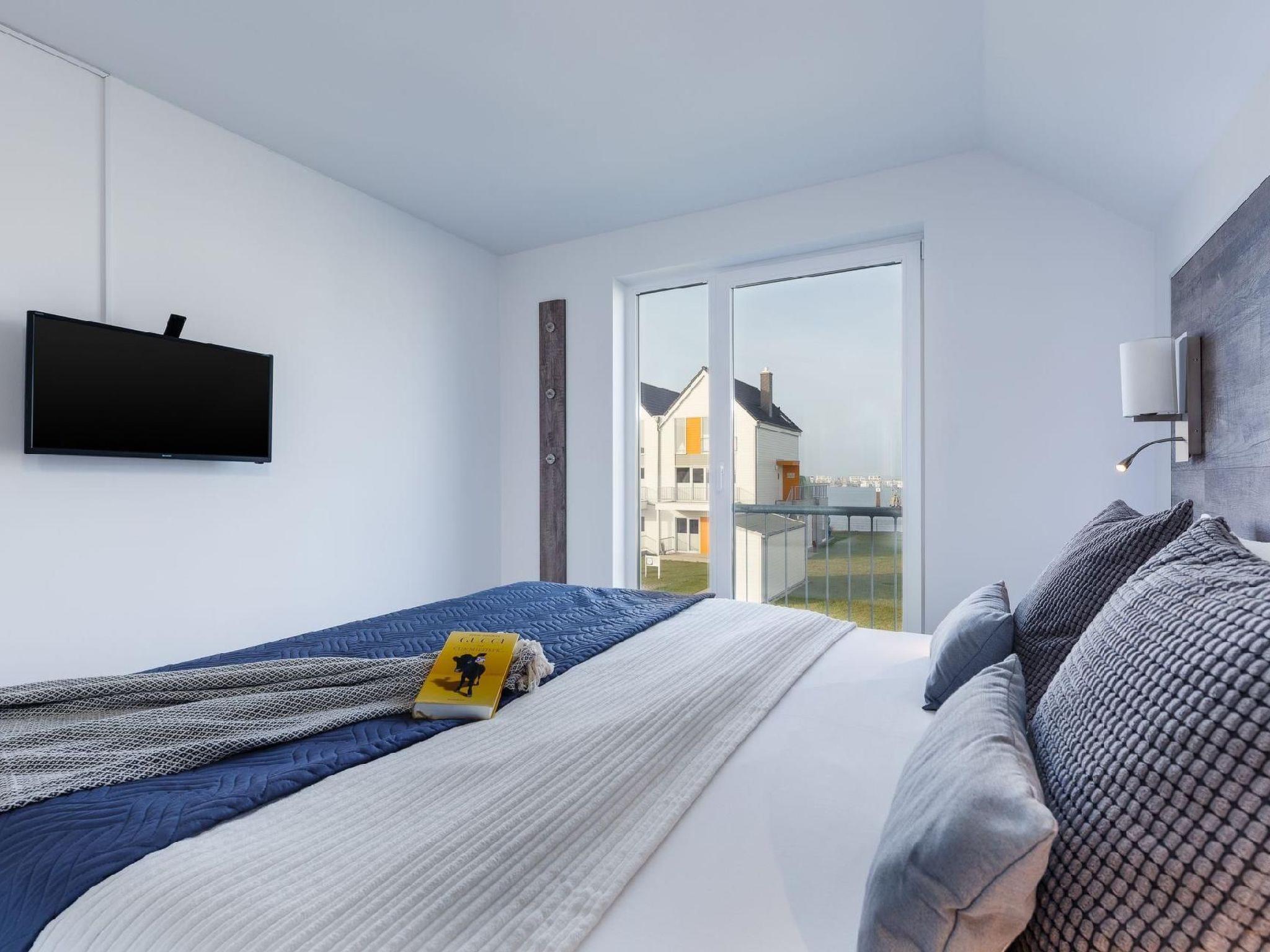 You enter the Captain James Cook Olpenitz holiday flat via an external staircase to the covered first balcony (10m²), which allows you to stay out in the fresh air even when it rains. The entrance area leads past a beautiful bathroom, which makes wellness hearts beat faster, as it has a floor-level XXL shower and a sauna (infrared cabin) with coloured light therapy. On the other side are two well-designed bedrooms with space for four adults and a marvellous view of the water. The master bedroom has a waterbed with a medium mattress (1.80 x 2.20), while a box-spring bed (1.80 x 2.00) awaits you in the second bedroom with an additional flat-screen TV. A fifth person is possible on request, the sleeping accommodation would be on the large sofa which has a bed function. However, the focus is on the perfectly realised, light-flooded living and dining area with a wood-burning stove and floor-to-ceiling windows that connect the living area with nature. The integration of the open-plan kitchen with its excellent equipment and functional design means that nothing stands in the way of cosy get-togethers, even when preparing all kinds of delicacies. The round wood-burning stove between the living room and dining area lends the room a special atmosphere. Equipment: Kitchen: filter coffee machine, Dolce Gusto capsule coffee machine, tea maker (Bodum), induction hob, oven, toaster, microwave, kettle, fridge, dishwasher, washer-dryer, crockery, kitchen utensils, underfloor heating. Bedroom 1: Waterbed, medium comfort at approx. 28 degrees, 1.80 m x 2.20 m, wardrobe, 32-inch flat-screen TV, socket near the bed with USB, underfloor heating. Bedroom 2: box-spring bed 1.80 m x 2.00 m, wardrobe, 32-inch flat-screen TV, USB socket near the bed, underfloor heating. Bathroom: floor-level XXL walk-in shower 1.30m x 0.80m, wall-hung toilet, countertop washbasin, shower stool, hairdryer, make-up mirror, infrared sauna cabin with colour light therapy, towel heating, underfloor heating. Living area: dining table with chairs, chests of drawers, sitting area with sofa and sofa bed, 42-inch flat-screen TV, WiFi, telephone, Bluetooth music centre, books, various games, children's toys, wood-burning fireplace, underfloor heating, balcony: garden furniture. General: iron, ironing board, clothes horse, hall wardrobe, vinyl flooring, hoover, children's travel cot with pillow and blanket, free private car park with electric charging point in front of the house. Lockable bicycle shed.