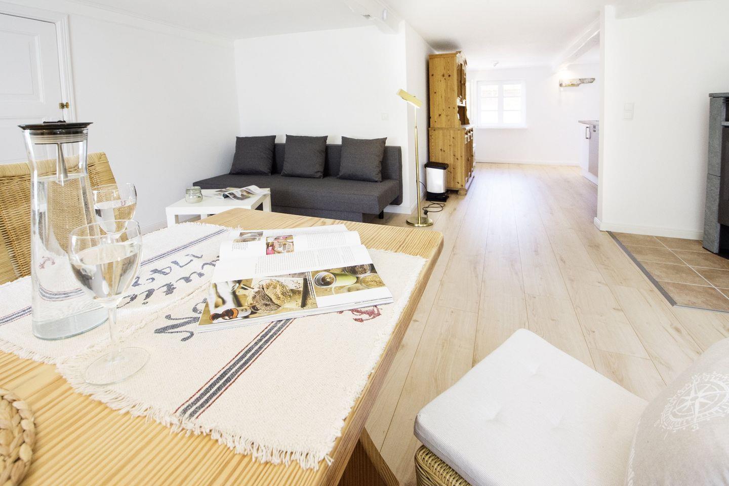 Diese Wohnung befindet sich in einem ehemaligen Bauernhaus und ist kernsaniert. Sie bietet auf 60m² Platz für bis zu 4 Personen. Das Schlafzimmer bietet ein Doppelbett & weitere Schlafmöglichkeiten bietet das Schlafsofa. Sollte das Wetter einmal nicht mitspielen machen Sie es sich vor dem Kamin im Wohnzimmer gemütlich. Im Sommer begeistert die Wohnung durch den gemeinschaftlichen 2000m² großen Garten. Bitte beachten Sie, dass die Durchgangshöhe mit 1,80m niedrig ausfällt!