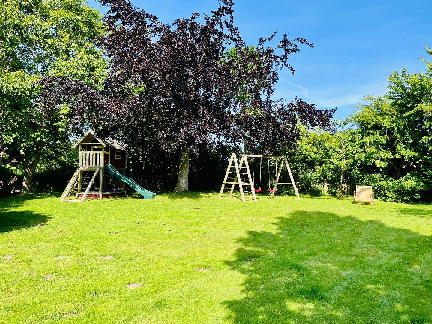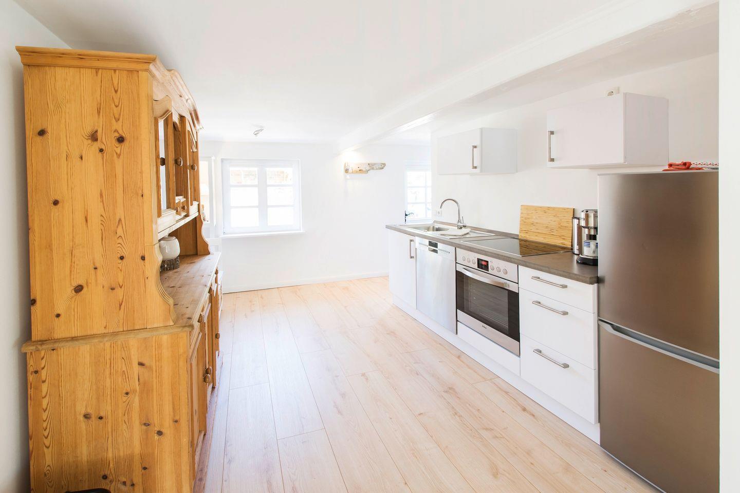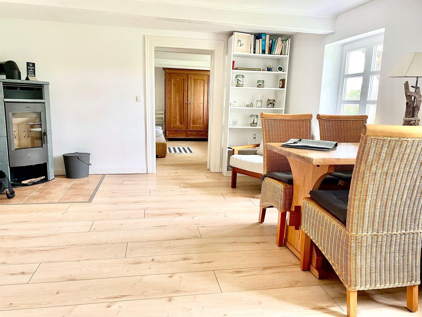 Die schöne Wohnung "Süd" befindet sich in einem von Charme erfüllten ehemaligen Bauernhaus und ist kernsaniert. Sie bietet auf 60m² und mit Platz für bis zu 4 Personen. Das Badezimmer verfügt über eine ebenerdige Dusche und ist mit einem Handtuchheizkörper, einem Kosmetikspiegel und einem Föhn ausgestattet. In der vollausgestatteten Küche kann nach Lust und Laune zusammen gekocht werden. In dem gemütlichen Wohn- und Essbereich bietet das Schlafsofa (160c200cm) eine weitere Schlafmöglichkeit. Sollte das Wetter einmal nicht mitspielen, kann man es sich vor dem Kaminofen gemütlich machen und dem Knistern des Feuers lauschen oder Filme und Serien via Netflix erleben. Das geräumige Schlafzimmer hat ein gemütliches Doppelbett (180x200cm) und einen Kleiderschrank. Für die Kleinen sind ein Kinderreisebett und ein Hochstuhl vorhanden. Ihr Vierbeiner ist ebenfalls herzlich willkommen! Lassen Sie die Kinder mit dem Hund im Garten spielen und lehnen Sie sich zurück und genießen Sie Ihren Urlaub in vollen Zügen. Die Kids werden dank Klettergerüst mit Rutsche, Schaukel und einem Sandkasten bestens beschäftigt sein. Erholen Sie sich in der gemeinschaftlichen finnischen Fasssauna und lassen Sie den Alltag hinter sich bei dem traumhaften Blick auf die Landschaft. Genießen Sie die Ruhe in dem großen Garten! Dieser steht ebenfalls den 3 weiteren Ferienwohnungen des Reetdachhauses zur Verfügung, jedoch sind durch die 2000m² genügend Platz für alle da. Der Garten ist zu 3 Seiten eingezäunt, an der 4. Seite schließt das Grundstück durch einen Knick ab. Ein Stellplatz ist vorhanden.