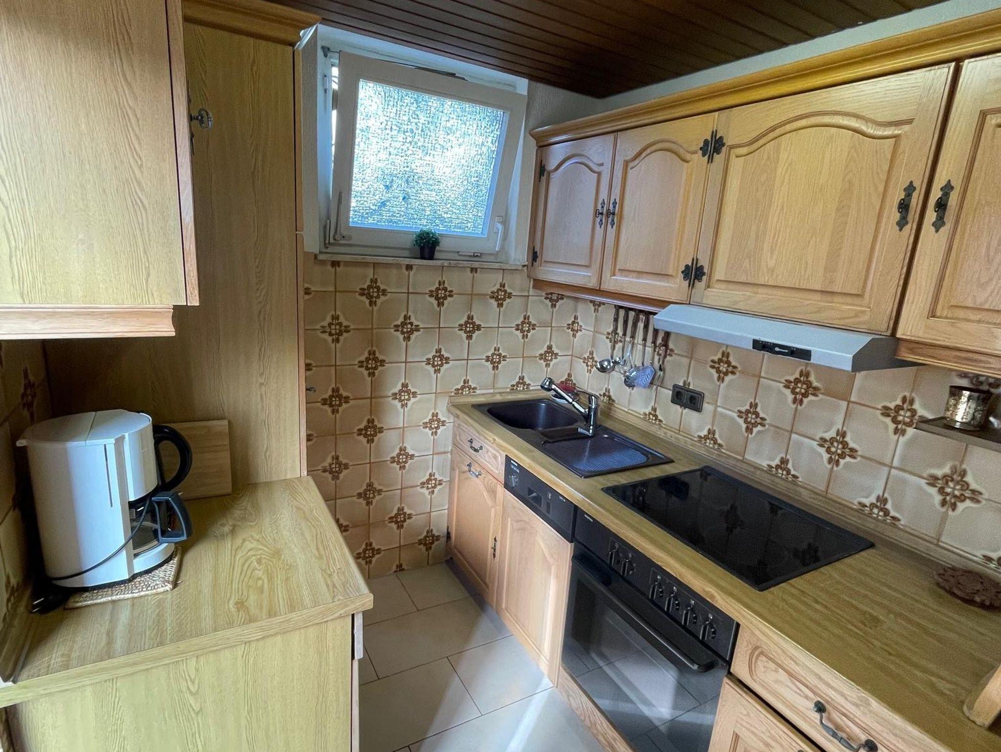 Im Erdgeschoss befindet sich ein Schlafzimmer für eine Person mit angeschlossenem Bad. Außerdem ein separates WC. Im Obergeschoss befindet sich ein Doppelschlafzimmer, eine voll ausgestattete Küche, eine kleines Nebenzimmer und das große Wohn-Esszimmer. In der Küche finden die Gäste Kaffeemaschien, Wasserkocher, Toaster, Mixer, Backofen, Herd und Kühlschrank mit Gefrierfach (keine Spülmaschine). SAT-TV. Kein WLAN. Mit Rolläden in allen Zimmern.