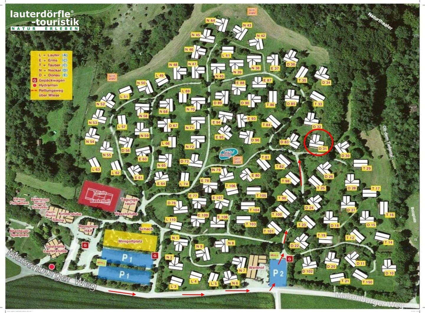 Ihnen stehen zwei Parkplätze pro Buchung am Rande der Anlage zur Verfügung. Das Gepäck kann mit einem Handwagen vom Parkplatz zum Haus transportiert werden.