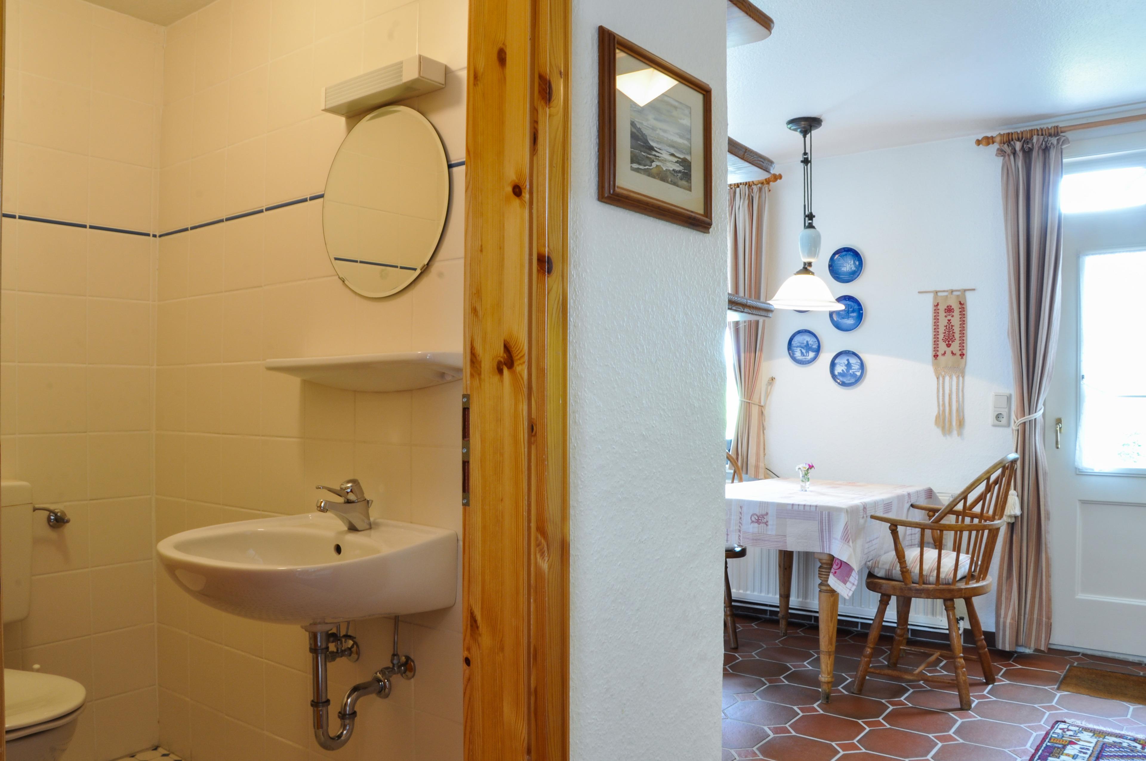 Wohnung Lise, die mittlere der drei Ferienunterkünfte, ist mit ca. 50 m2 Wohnfläche die kleinste im Haus Karoline. Sie bietet Platz für bis zu 3 Personen. Im Erdgeschoss befindet sich ein schöner Wohn- Essbereich mit integrierter, gut ausgestatteter Küche (Geschirrspüler und Mikrowelle) und ein kleines Gäste-WC. Badezimmer und die beiden Schlafzimmer, eines mit Doppelbett und eines mit Einzelbett sind im 1. Stock. Auf der Terrasse können Sie den Tag gemütlich ausklingen lassen.