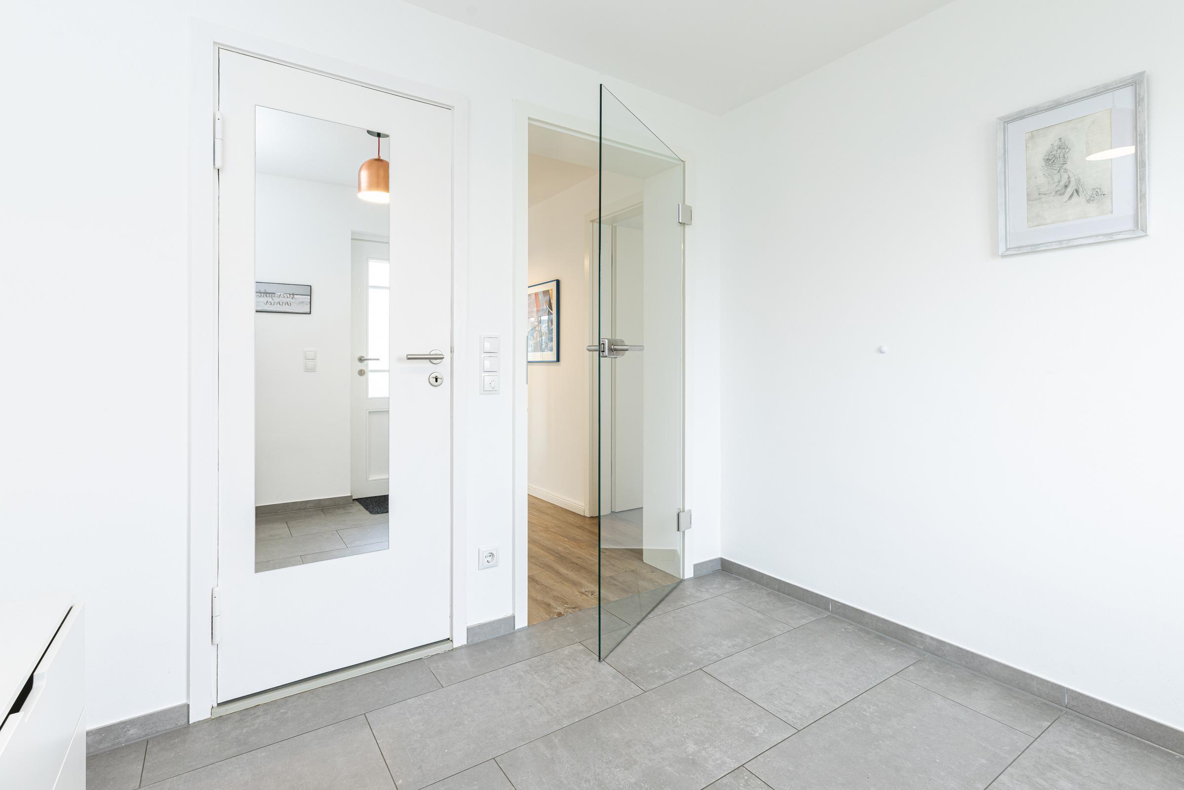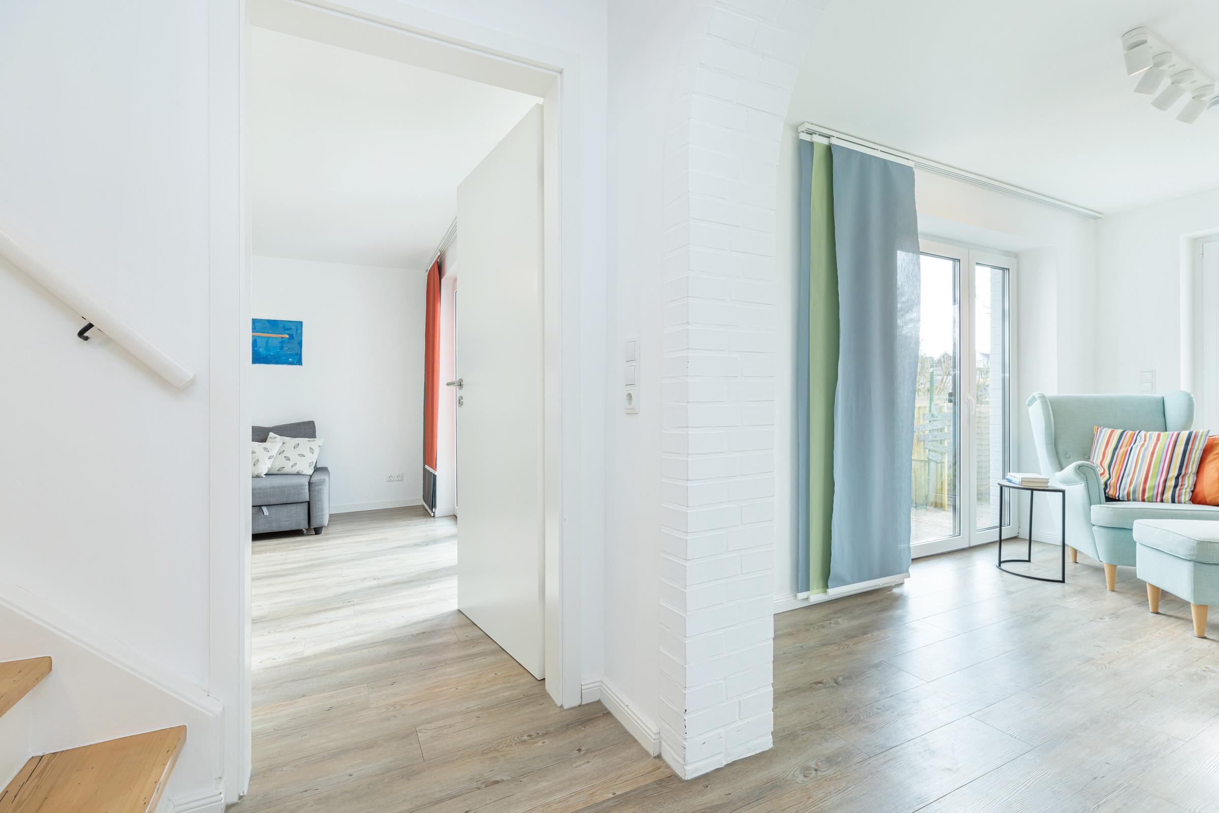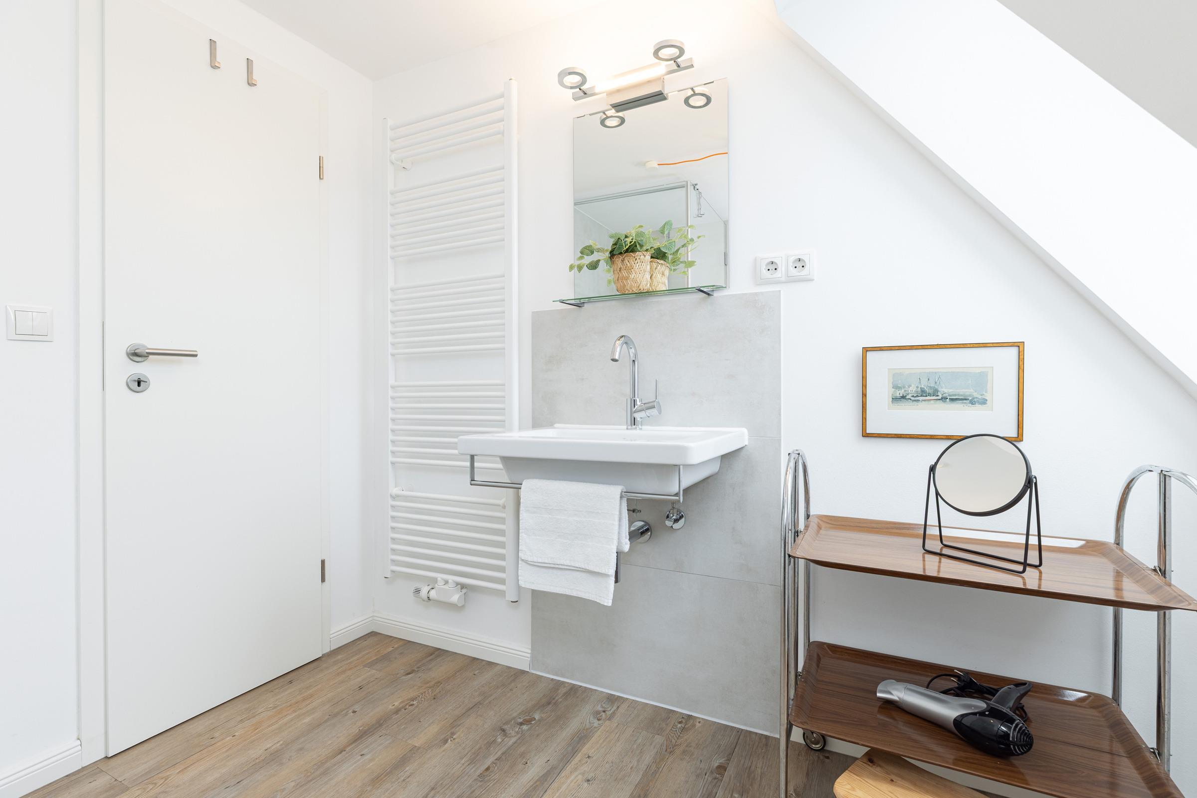 In der ersten Etage sind zwei separate Schlafzimmer. Ein Schlafzimmer mit Doppelbett (160x200 cm) sowie ein weiteres Schlafzimmer mit einer Schlafcouch (160x200 cm) und einem Einbauschrank. Sie haben die Wahl, auf beiden Etagen befindet sich ein modernes Duschbad mit Tageslicht. Ein Arbeitsplatz mit Internetanschluss ist in der Gaube des geräumigen Flurs im Obergeschoss gegeben.