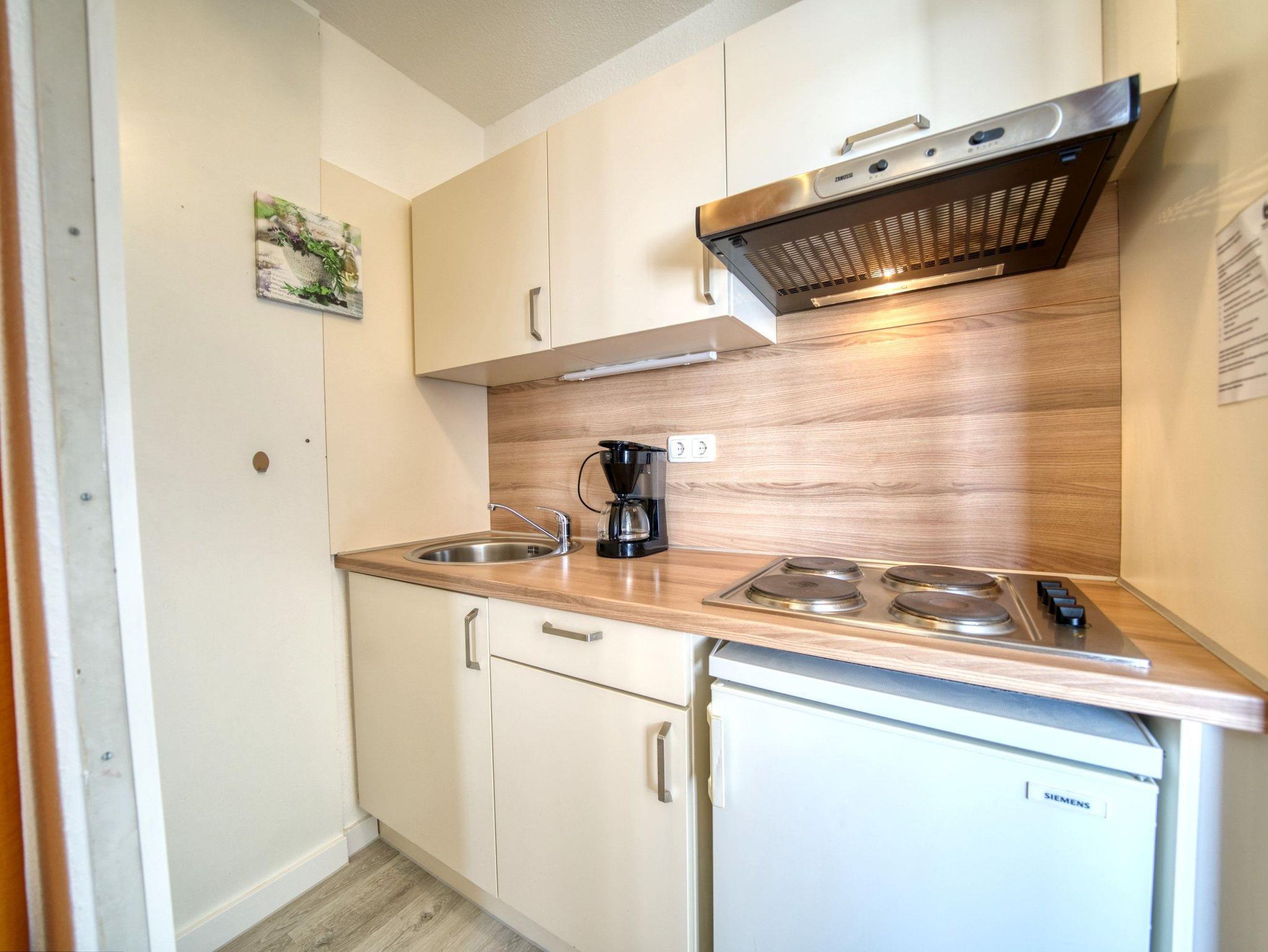 Praktische Küche mit 4-Plattenherd, Kühlschrank mit Gefrierfach, Filterkaffeemaschine, Toaster und Wasserkocher