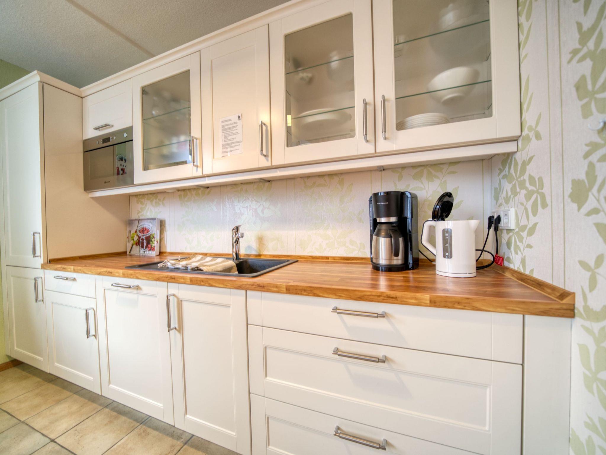 Komplett modernisierte Küche mit Kaffeemaschine, Wasserkocher, Toaster, Kühlschrank mit Gefrierfach, 4-Platten-Herd und Backofen