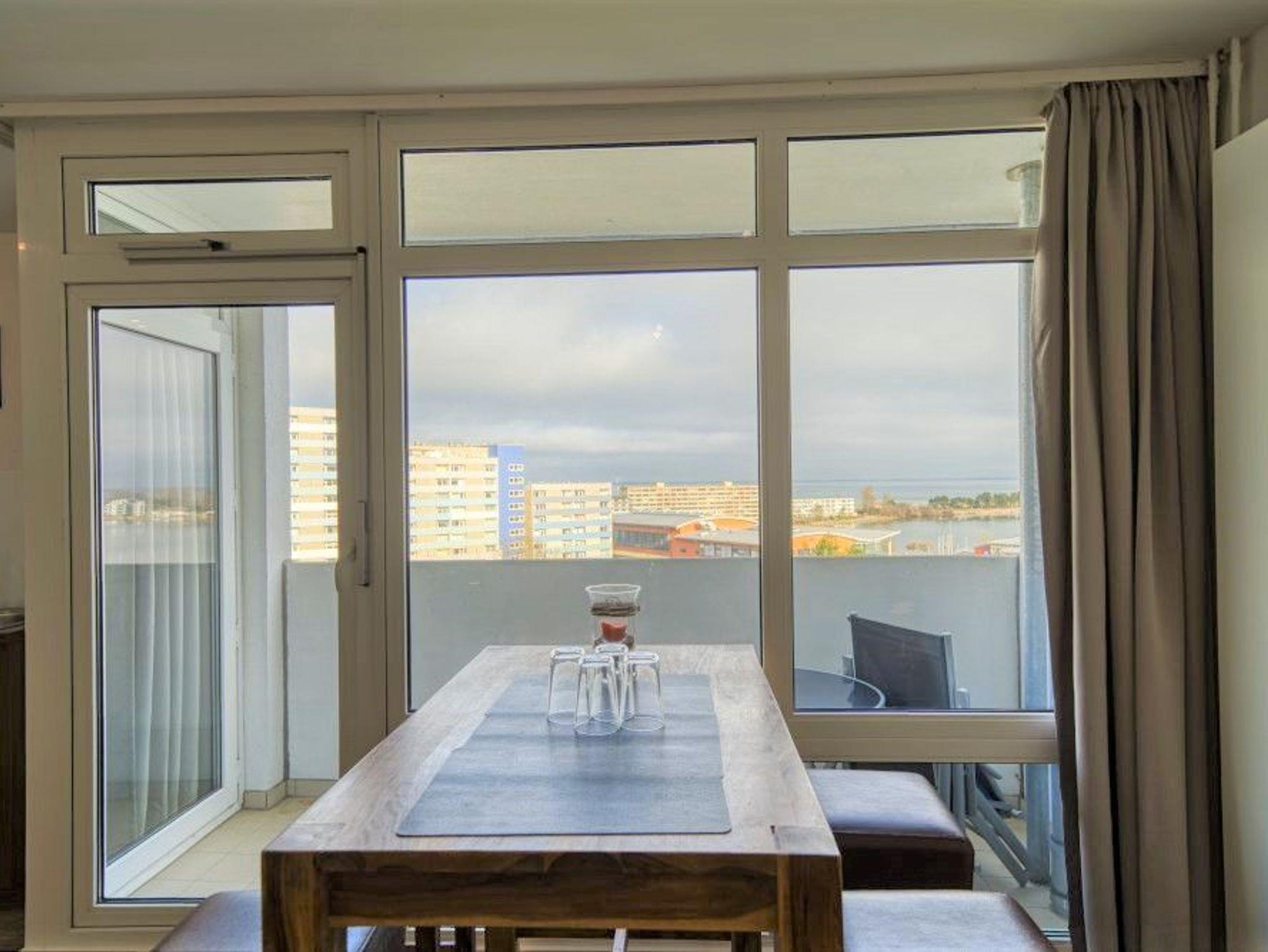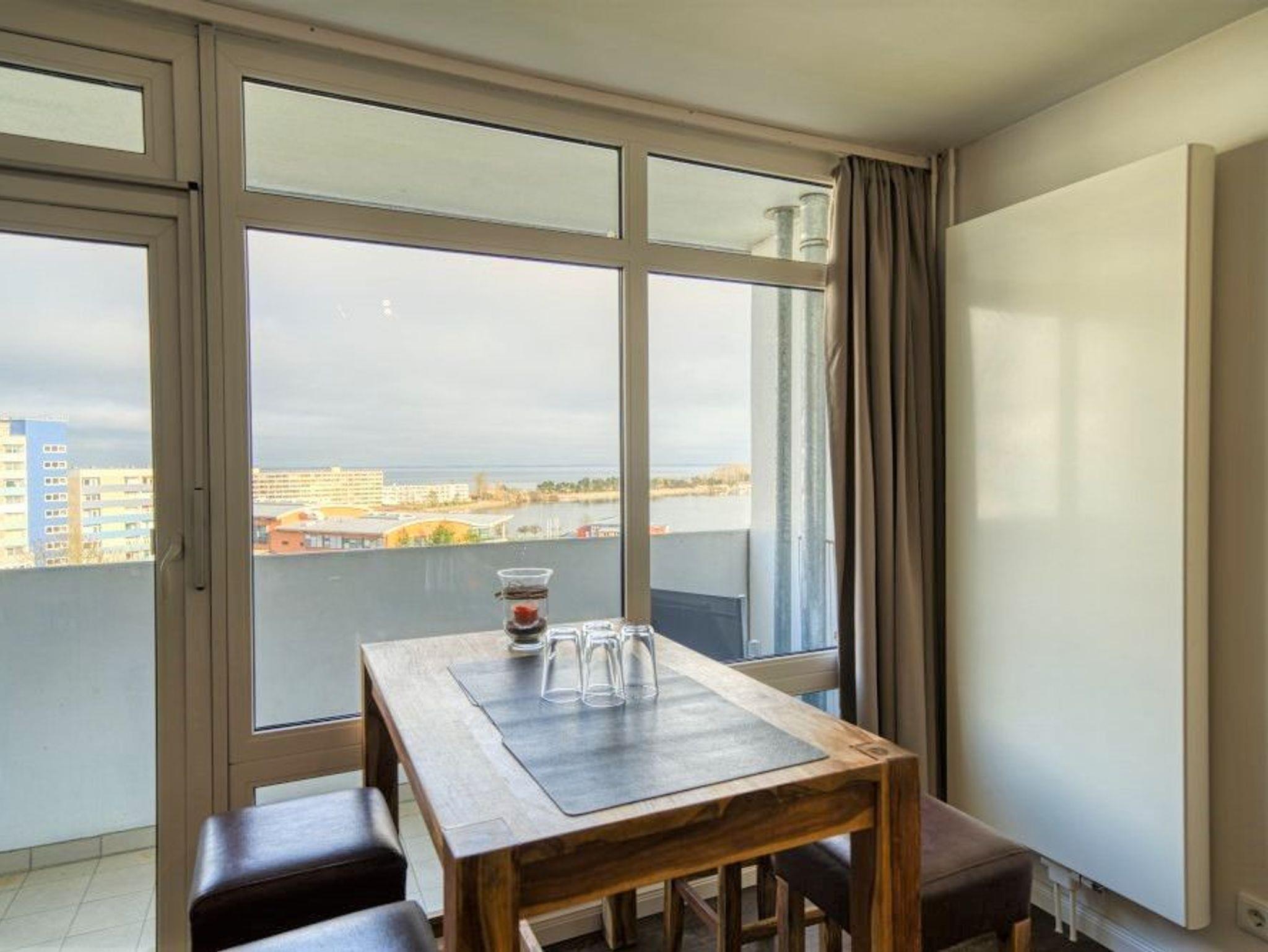 Die Wohnung liegt im Haus K Ferienpark, in der 8. Etage, mit Balkon zum Innenhof, der einen schönen Blick auf die Grünanlagen und die Ostsee Richtung Fehmarn bietet.