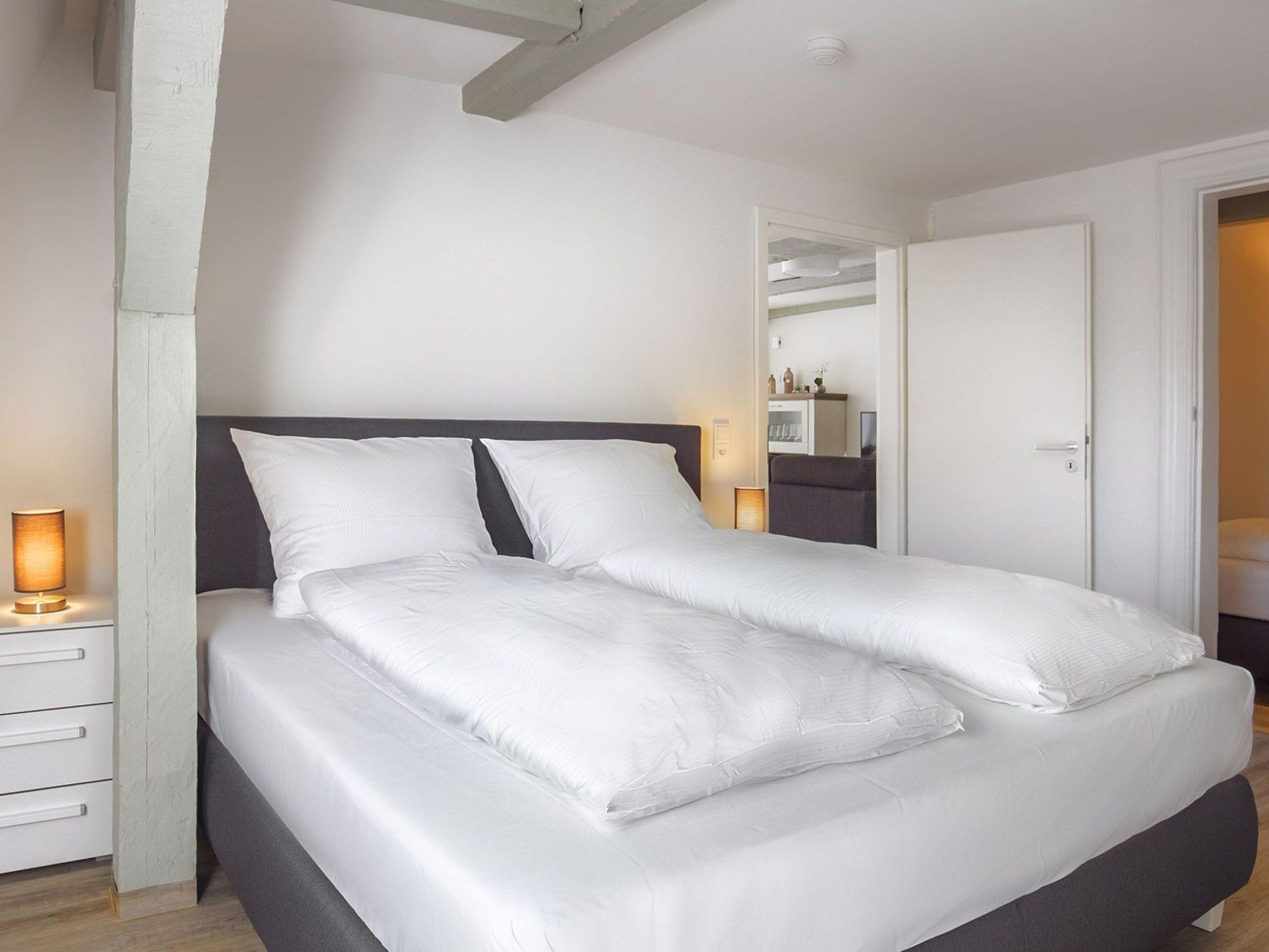 Die Ferienwohnung ist besonders für Familien oder Paare geeignet, da sie über zwei separate Schlafzimmer verfügt. Das Elternschlafzimmer ist mit einem Doppel-Boxspringbett und einem gemütlichen Ohrensessel eingerichtet, der zum Lesen einlädt. Das zweite Schlafzimmer verfügt über zwei Einzelbetten, die Rückzugsmöglichkeiten und Erholung bieten. Für Verdunkelung und nächtliche Ruhe sorgen blickdichte Plissees. Von den Schlafzimmern erreichen Sie bequem das großzügige Tageslicht-Bad mit ebenerdiger Dusche, Handtuchwärmer, Waschbecken und WC. Die offene und voll ausgestattete Küche mit direktem Zugang zum großen Balkon ist mit Spülmaschine, Mikrowelle und Backofen ausgestattet und garantiert während Ihres Aufenthaltes alle Annehmlichkeiten. Kaffeeliebhaber finden neben einer klassischen Filterkaffeemaschine auch eine Nespresso Maschine mit Milchaufschäumer.