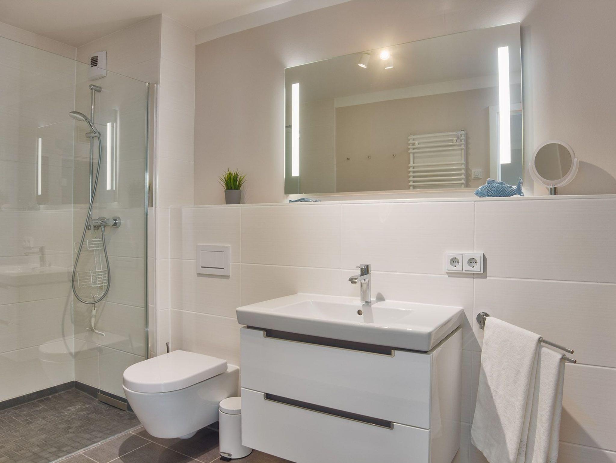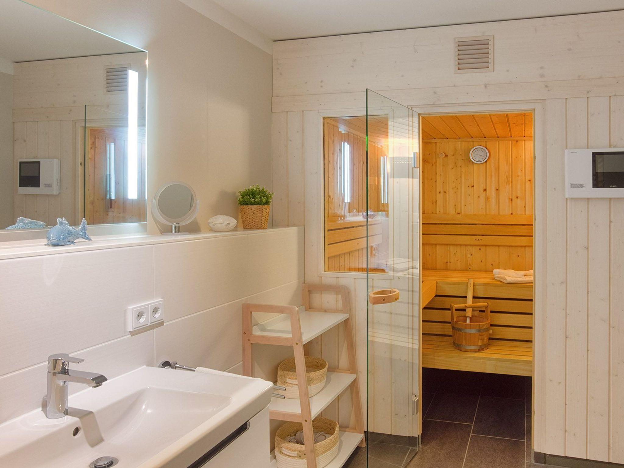 Nach einem aktiven Tag an der Ostsee bietet das luxuriöse Badezimmer mit ebenerdiger Dusche und integrierter Sauna wohltuende Entspannung. Zusätzlich stehen eine Waschmaschine und ein Trockner in einem separaten Raum zur Verfügung.