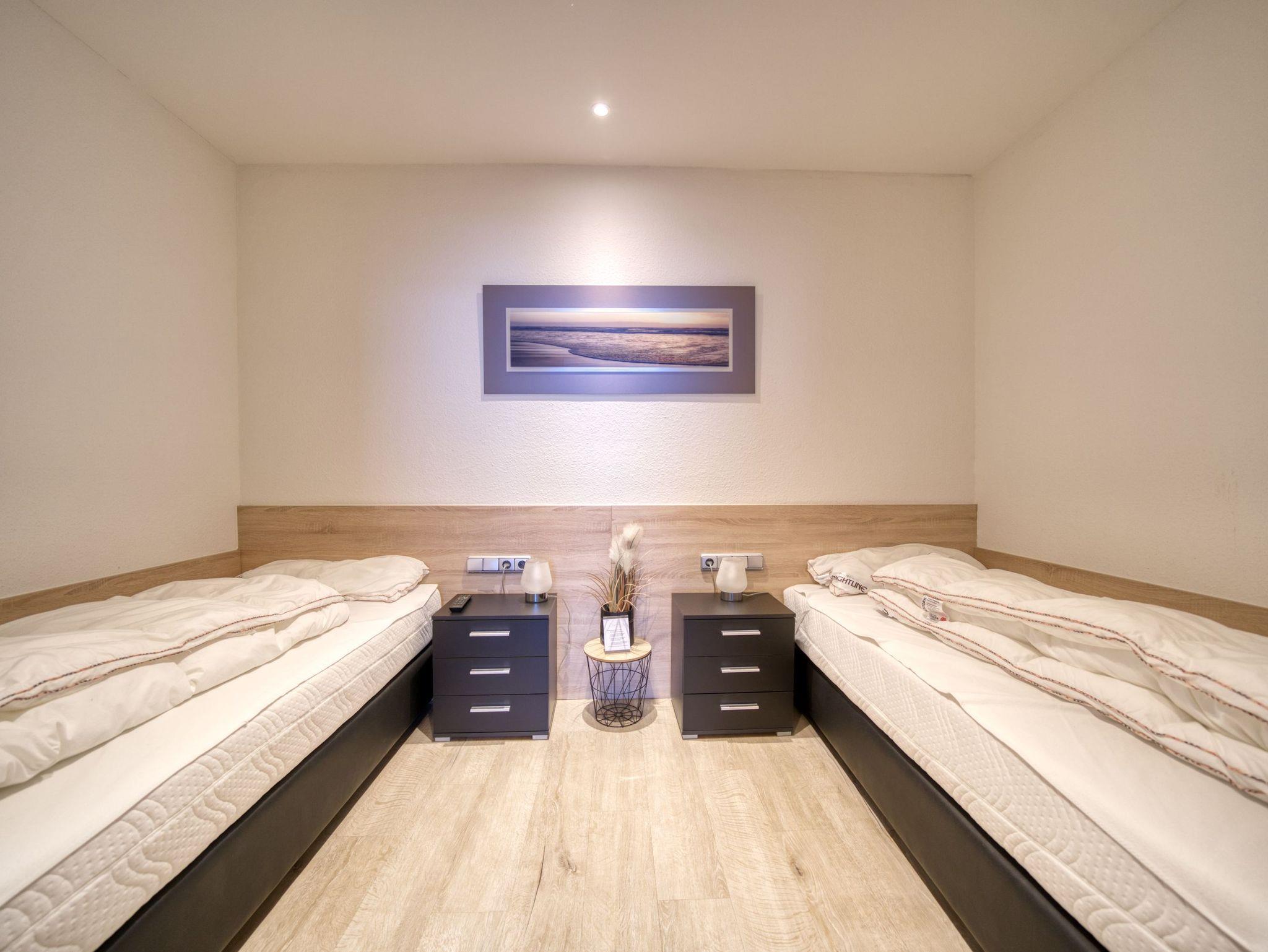 Schlafbereich mit hochwertigen Boxspring-Einzelbetten (zusätzlicher TV)