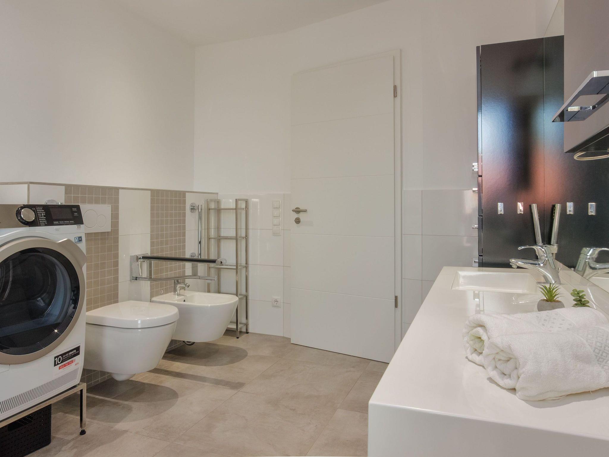 Das komfortable Badezimmer mit Tageslicht verfügt über eine barrierefreie, ebenerdige Dusche, WC und Bidet, beleuchtete Spiegel und Handtuchwärmer. Haltegriffe in der Dusche und beim WC, Duschhocker und ein unterfahrbarer Waschtisch sind praktische Helfer. Eine Waschmaschine und ein Trockner sind hier zudem zur bequemen Nutzung clever integriert. Zusätzlich gibt es in der Unterkunft ein separates Gäste-WC.