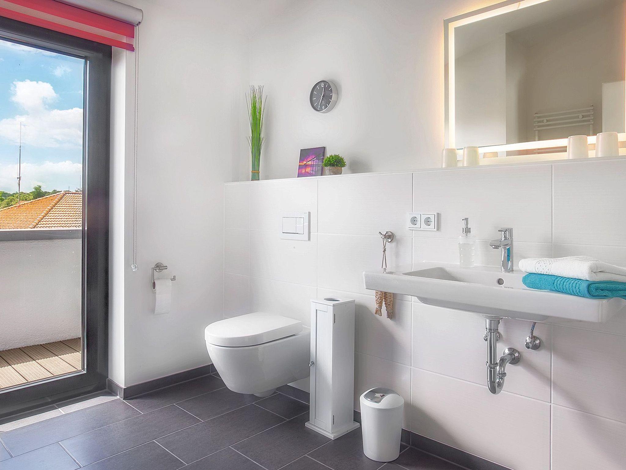 Das moderne Badezimmer überzeugt mit einer ebenerdigen Dusche, einem Handtuchwärmer und direktem Zugang zur Südterrasse, wo Sie sich nach einem erfrischenden Bad sonnen oder einfach die Seele baumeln lassen können. Ein separates Gäste-WC sorgt für zusätzlichen Komfort. Zudem steht Ihnen eine Waschmaschine zur Verfügung, sodass auch längere Aufenthalte problemlos möglich sind.
