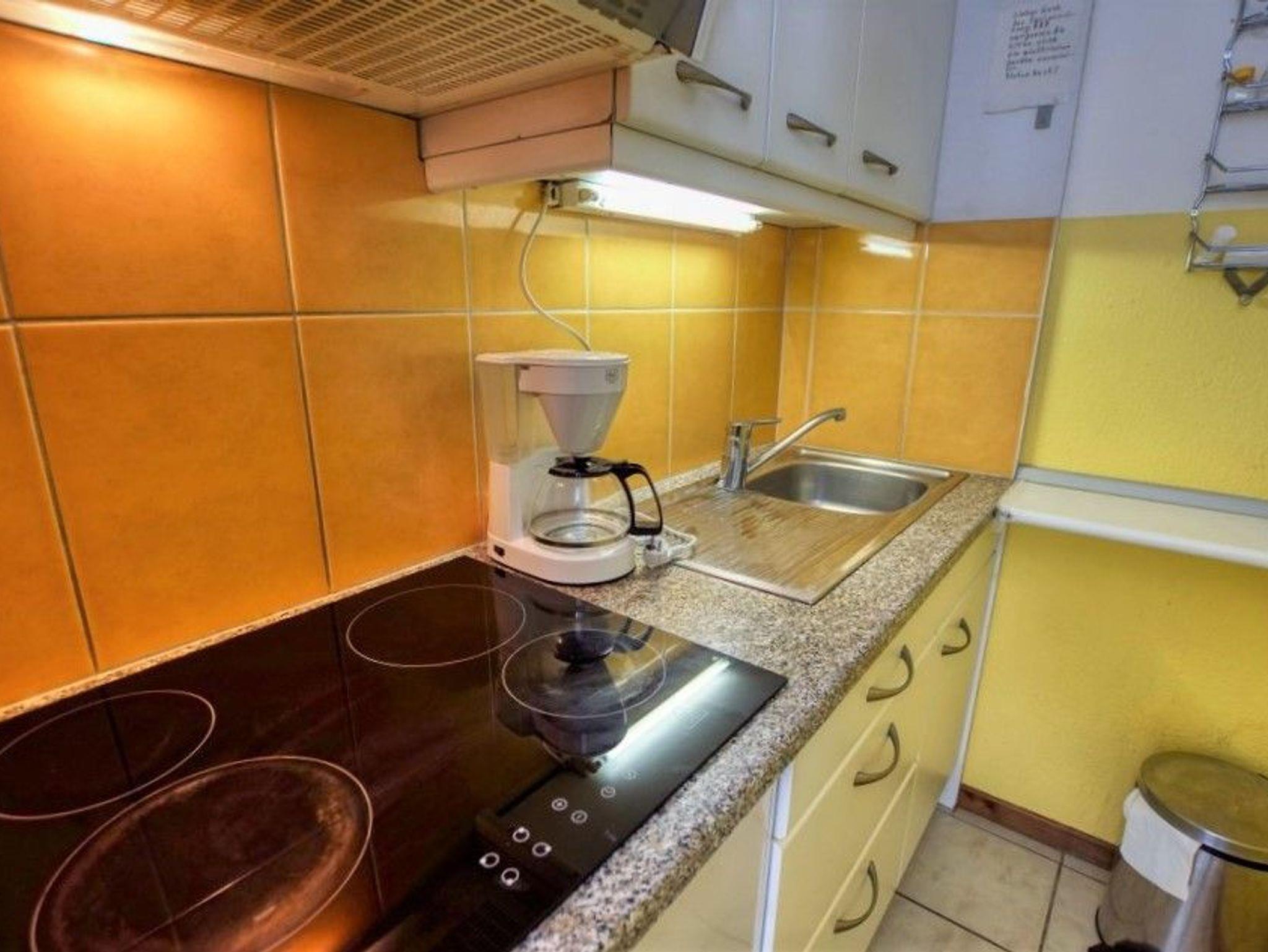 voll ausgestattete Küche mit 4-Platten-Herd, Kühlschrank, Mikrowelle, Geschirr [&] Kochutensilien