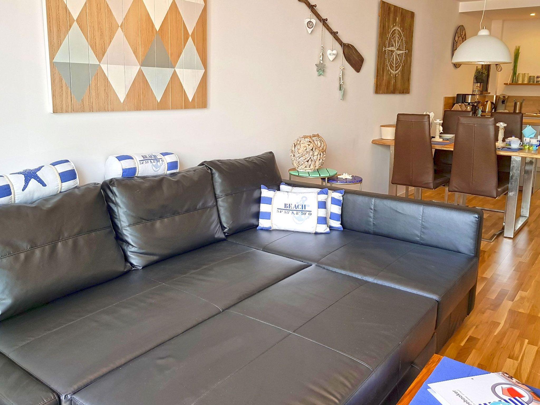 Mit einer Wohnfläche von ca. 58 m² im Erdgeschoss eignet sich diese Ferienwohnung ideal für 2 (+2) Personen und einen Hund (gegen Gebühr). Das maritime Flair zieht sich durch die gesamte, neu und modern eingerichtete Unterkunft. Der offene Wohnbereich mit Echtholzparkettboden sorgt für ein gemütliches Ambiente. Eine komfortable Schlafcouch, ein 40'' LED-TV, DVD-Player, Radio mit USB/Bluetooth und WLAN stehen für Unterhaltung bereit. Bodentiefe Fenster lassen viel Tageslicht herein und ermöglichen von der Couch aus einen direkten Blick auf die möblierte Terrasse. Durch die Nordausrichtung können Sie hier bereits morgens die Sonne beim Frühstück genießen und das Stadtleben beobachten.