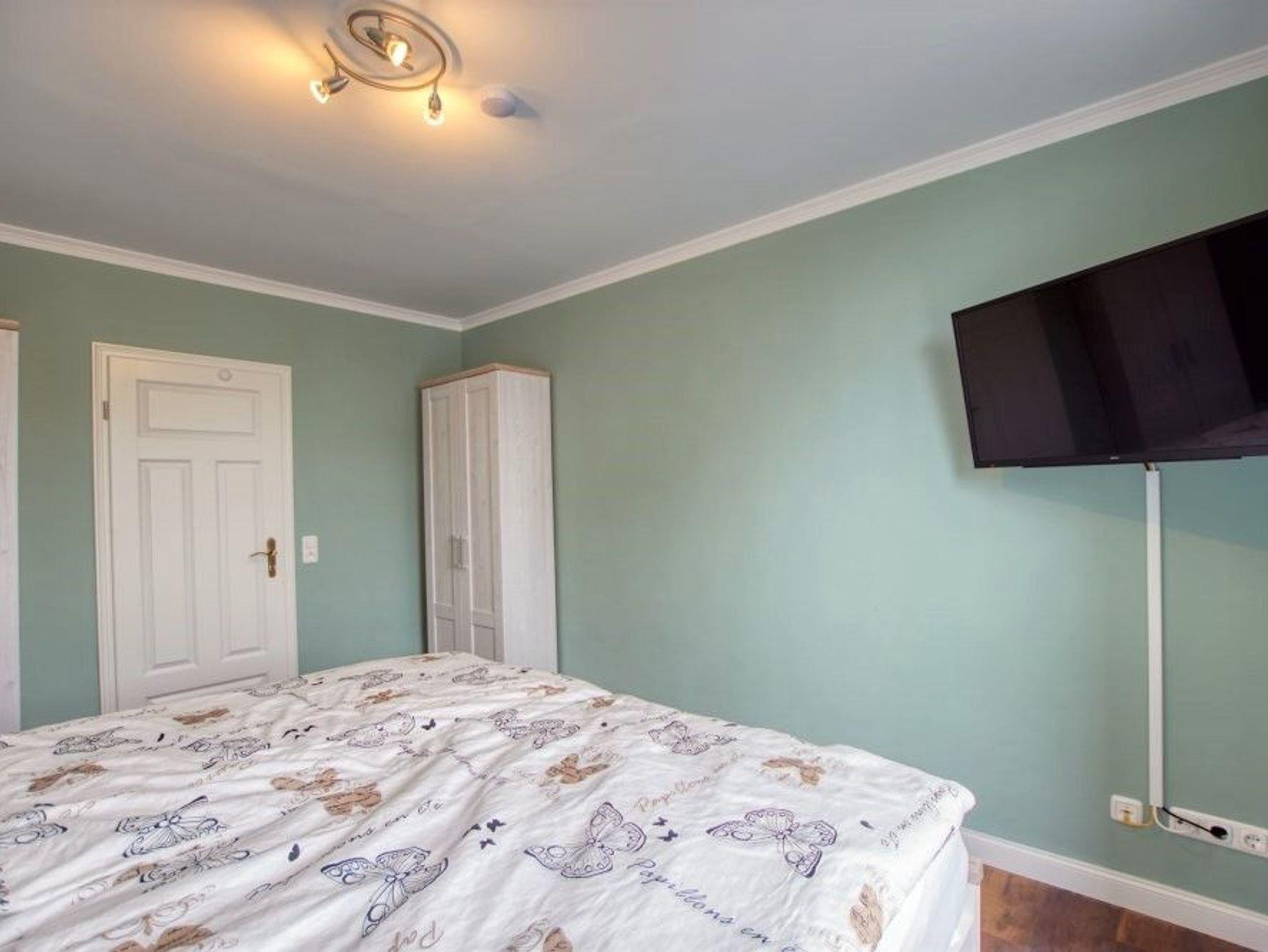 Schlafzimmer: Separat gelegen, mit Doppelbett und zusätzlichem TV, Ausrichtung zum Garten