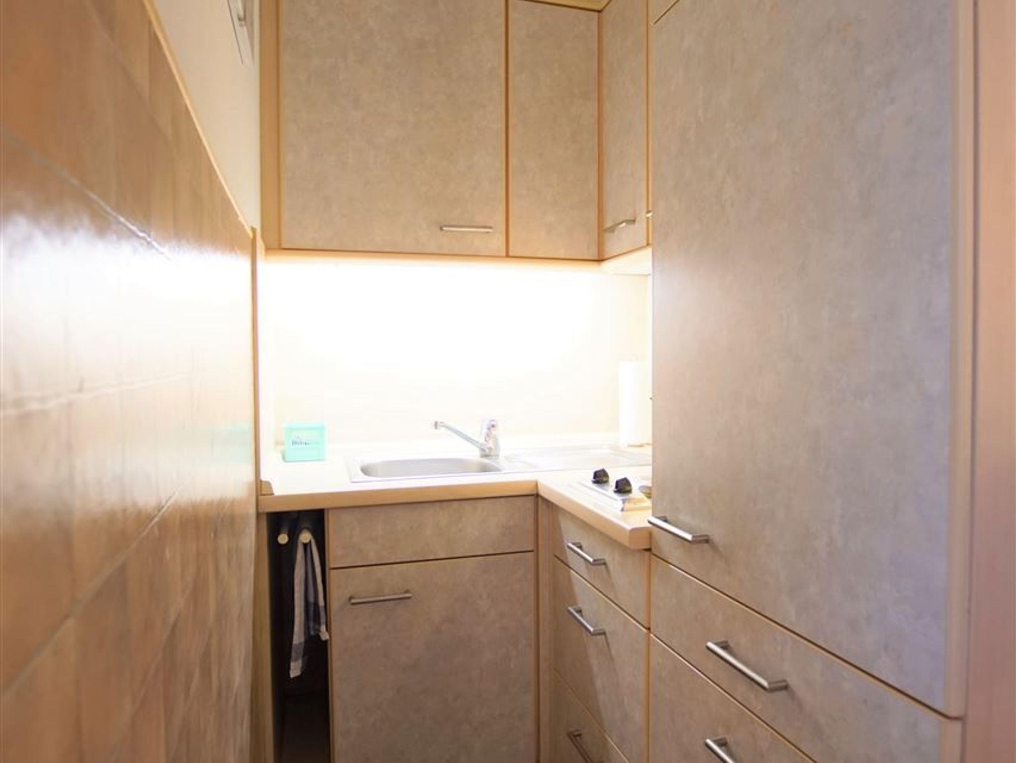 Küche mit 2-Plattenherd, Kühlschrank inkl. Gefrierfach, Mikrowelle, Mini-Backofen, Kaffeemaschine, Toaster und Wasserkocher