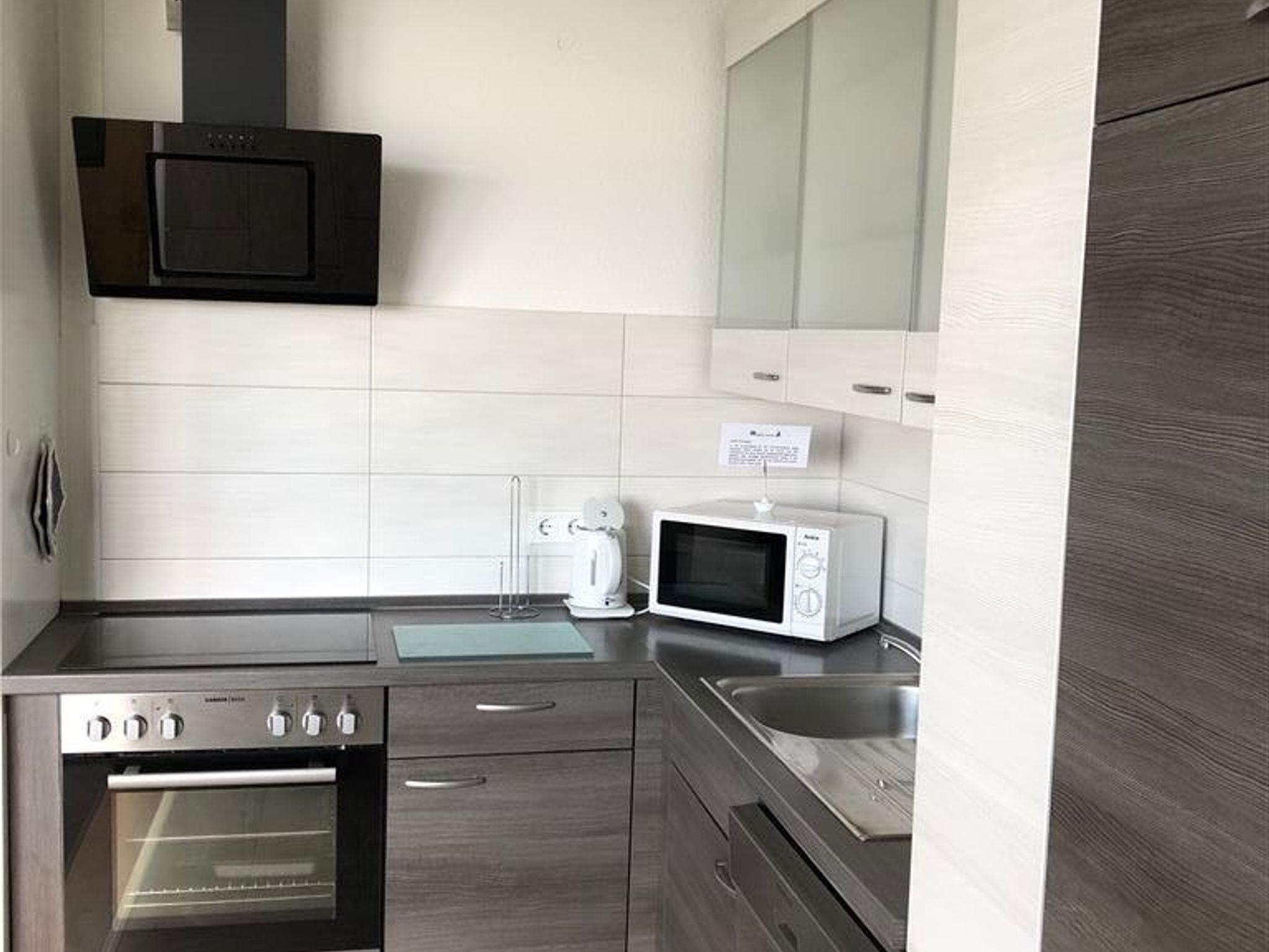 voll ausgestattete Küche mit Geschirrspüler, Backofen, Cerankochfeld, Kühlschrank mit Gefrierfach, Mikrowelle, Wasserkocher und Toaster