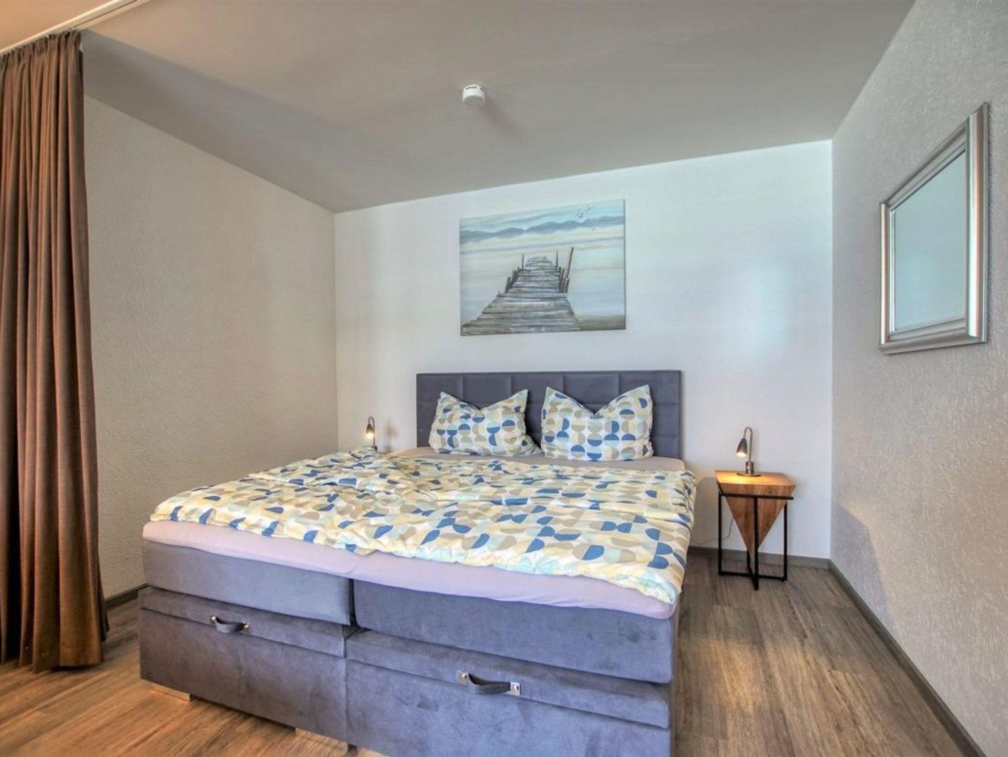 Elternschlafbereich: Doppel-Boxspringbett und Flachbildfernseher