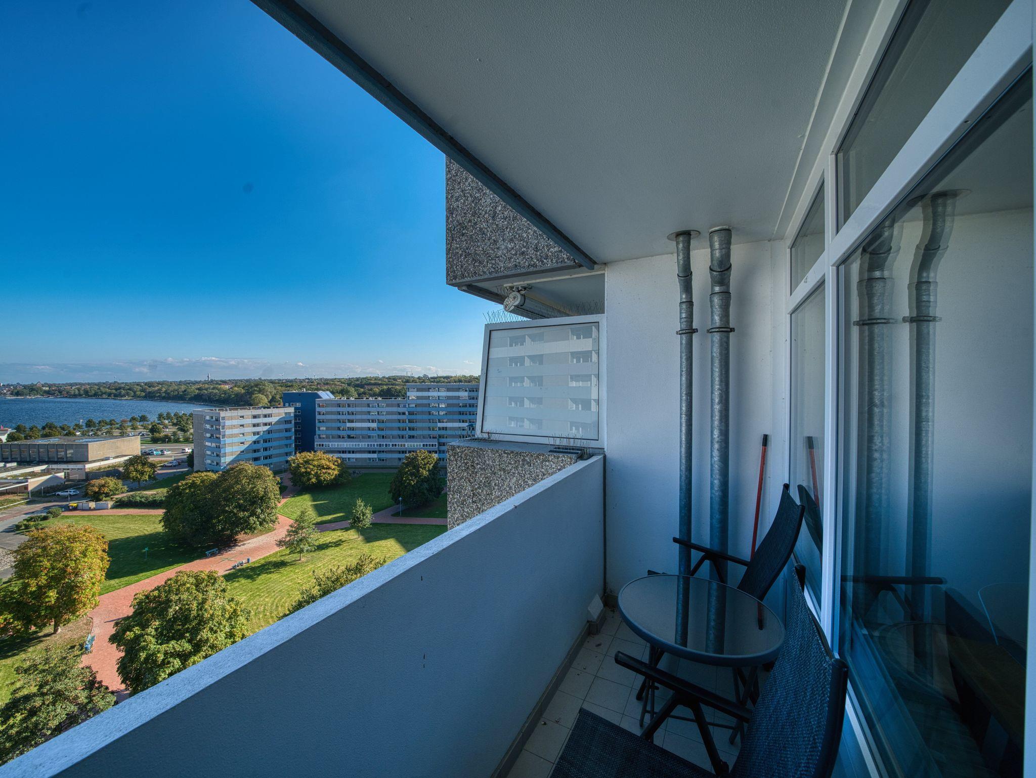 Die Ferienwohnung im Haus F, 10. Etage, mit Balkon zur Ostseite, bietet einen herrlichen Blick auf die Ostsee mit Fehmarnsundbrücke und den Binnensee inklusive Stadt- und Yachthafen.