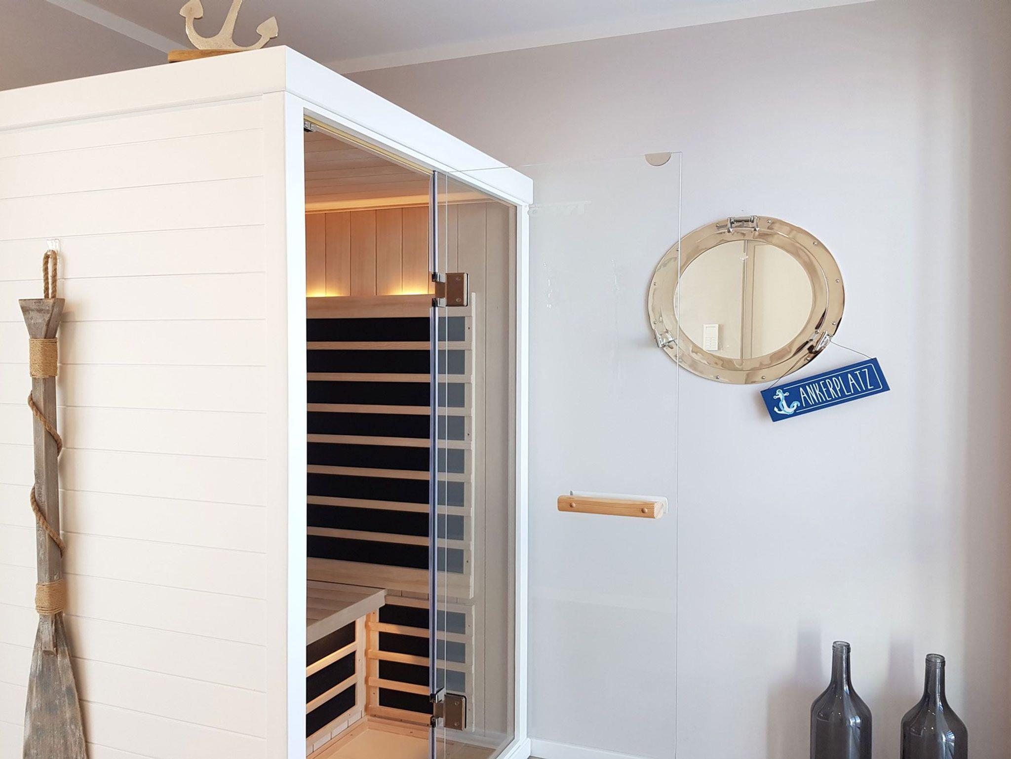 Das stilvolle Badezimmer mit ebenerdiger Dusche, Handtuchwärmer und hochwertigen Armaturen sorgt für Entspannung nach einem erlebnisreichen Tag. Für noch mehr Wohlbefinden steht Ihnen eine Infrarot-Sauna für zwei Personen zur Verfügung ? ideal, um sich nach einem langen Spaziergang an der frischen Ostseeluft wohltuend aufzuwärmen. Ein separates Gäste-WC im oberen Geschoss bietet zusätzlichen Komfort.