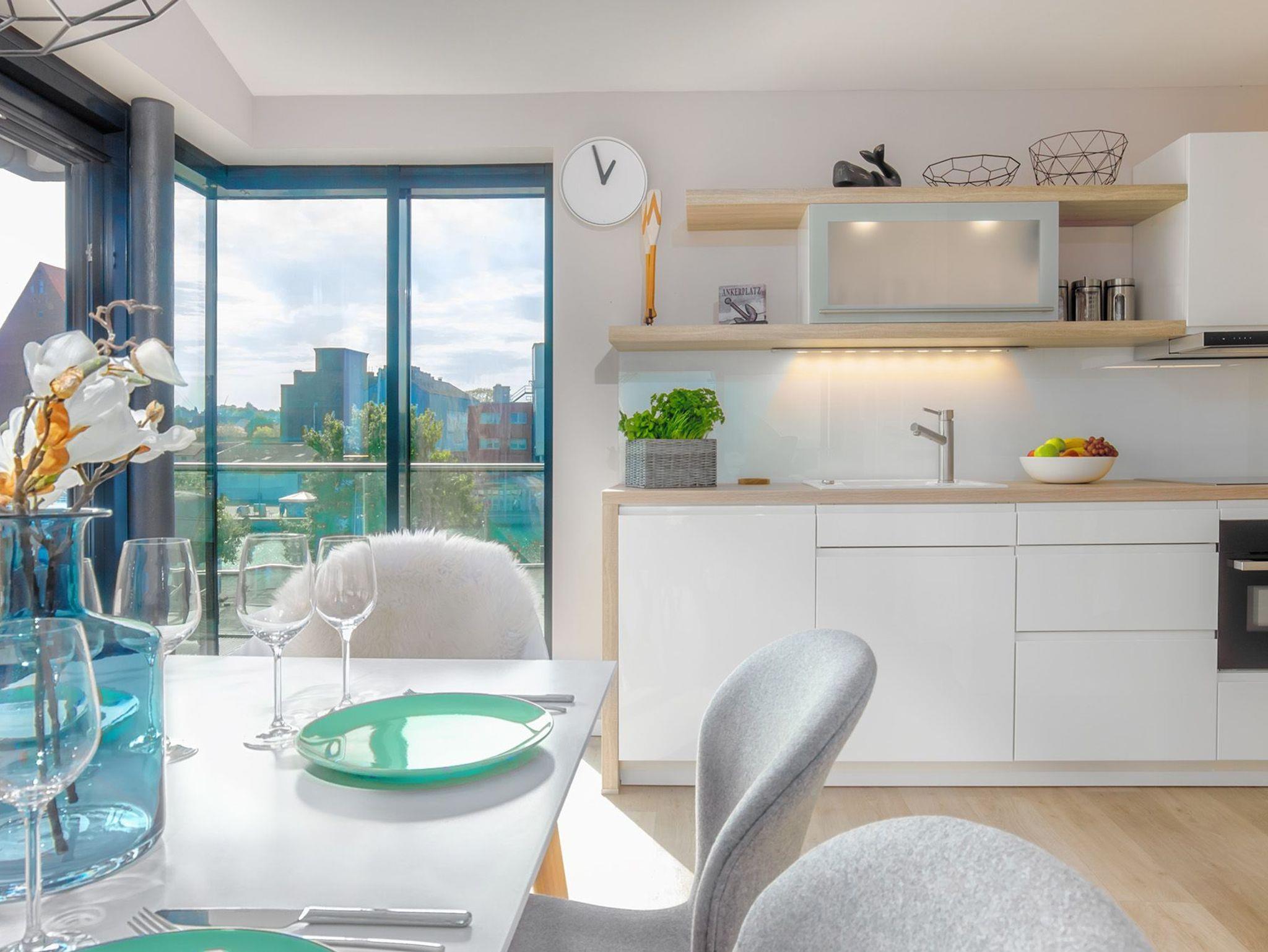 Der lichtdurchflutete Wohnbereich besticht durch moderne Eleganz und eine hochwertige Ausstattung. Großzügige Fensterfronten sorgen für ein offenes Wohngefühl und lassen den Blick über das glitzernde Wasser und die ein- und auslaufenden Jachten schweifen ? eine Kulisse, die pure Urlaubsatmosphäre verspricht. Die stilvolle Möblierung mit bequemer Couch, Liegestühlen und großem TV lädt zum Entspannen ein, während WLAN für erstklassige digitale Unterhaltung sorgt. Direkt angrenzend befindet sich der Essbereich, der mit seiner atemberaubenden Aussicht zum Verweilen einlädt. Die offene, voll ausgestattete Küche bietet Ihnen alles, was Sie für kulinarische Genüsse benötigen ? ob gemeinsames Frühstück bei Sonnenaufgang oder ein gemütliches Dinner mit Blick auf die Ostsee.