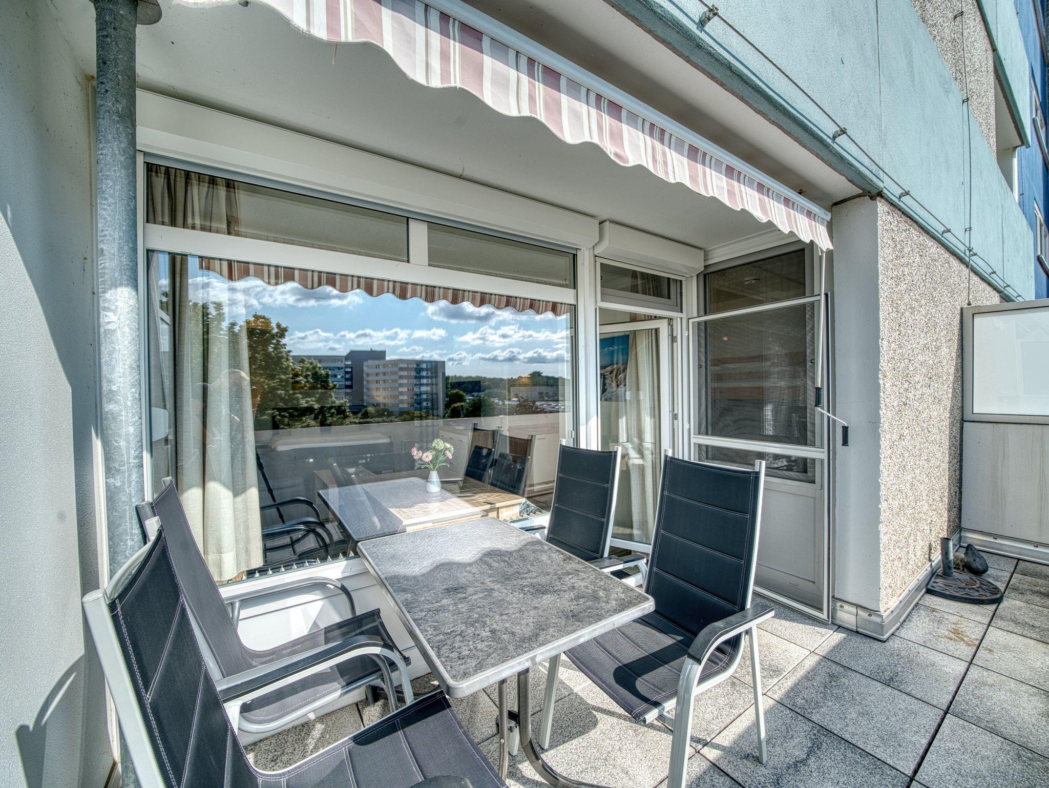 Die Wohnung befindet sich im Haus B des Ferienparks Heiligenhafen und wurde im Jahr 2019 renoviert. Sie liegt in der 3. Etage und bietet einen schönen Ausblick auf den Innenhof und den Binnensee. Besonders der extra große Balkon zur Südseite lädt dazu ein, die Sonne von morgens bis abends zu genießen. Der Balkon ist mit Gartenmöbeln und einer Markise ausgestattet.